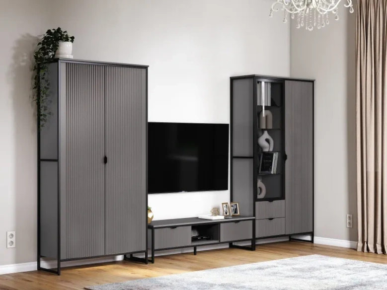Коллекцию модульной гостиной "Нора" отличает современный оригинальный стиль. Декоративная продольная фрезеровка на фазадах из МДФ и опоры на металлокаркасе цвета соответствуют модным тенденциям этого года в ведущих зарубежных коллекциях.