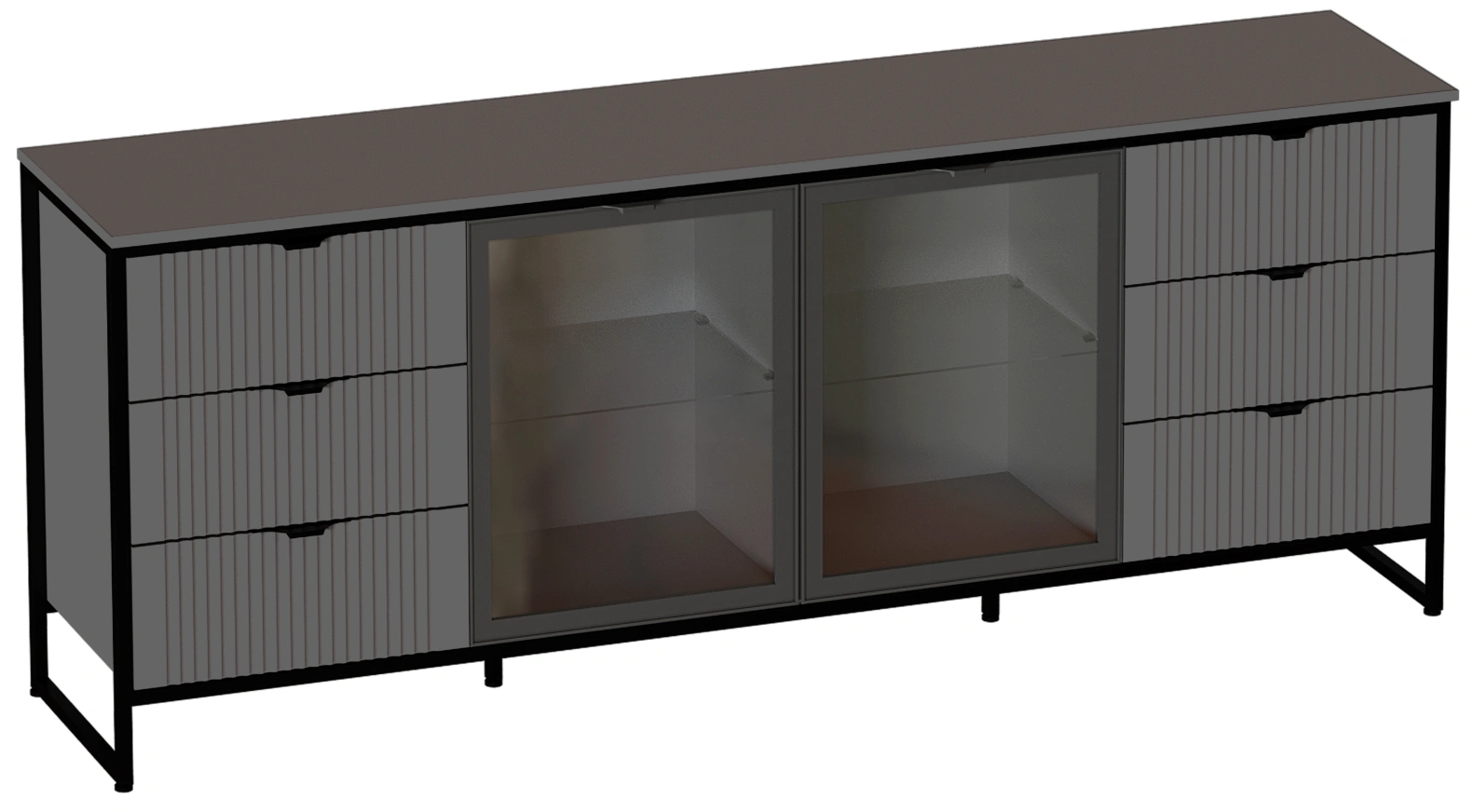 Тумба Нора, со стеклянными дверями, с полками и ящиками, металл бруклин / графит