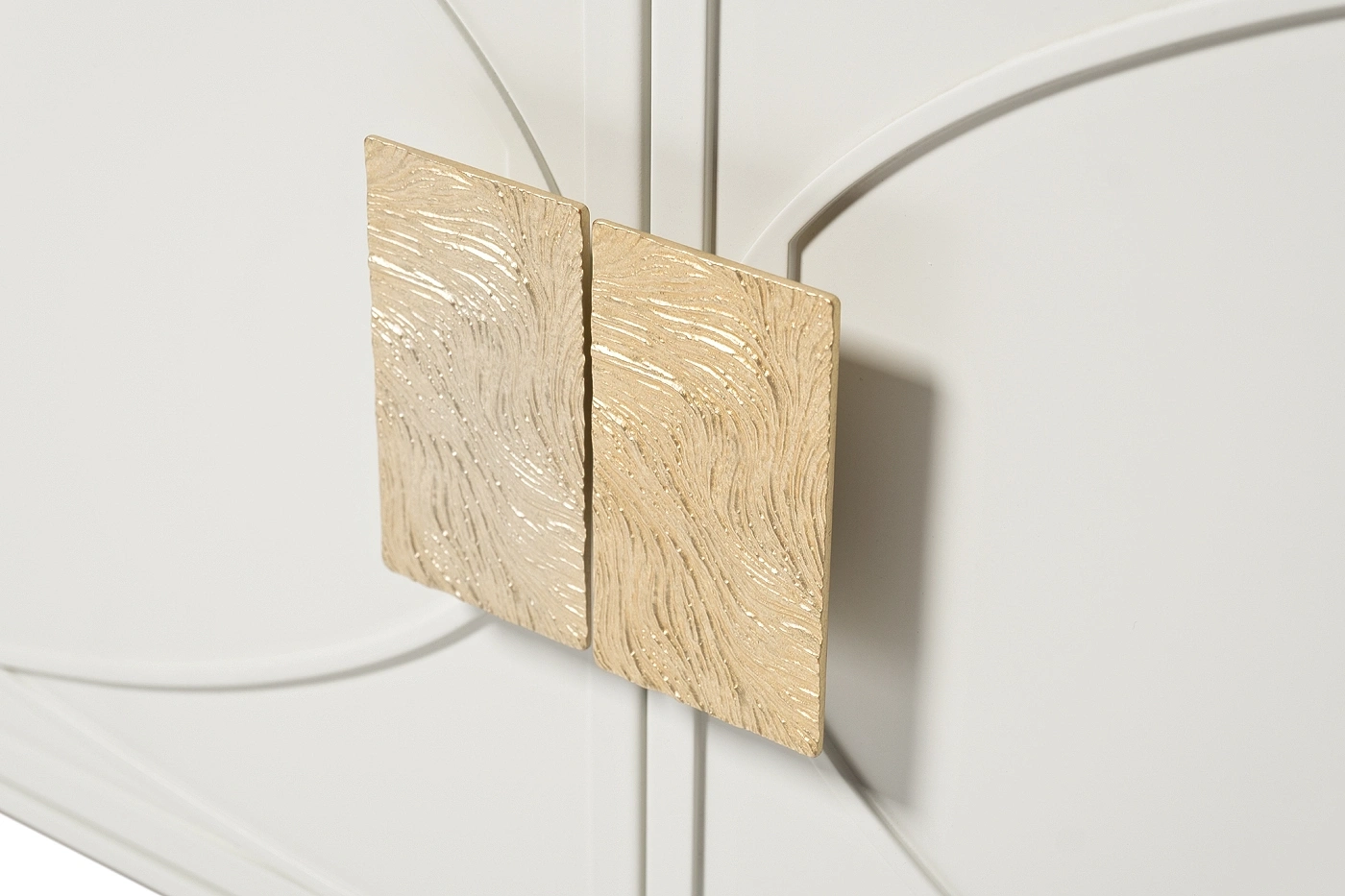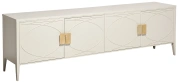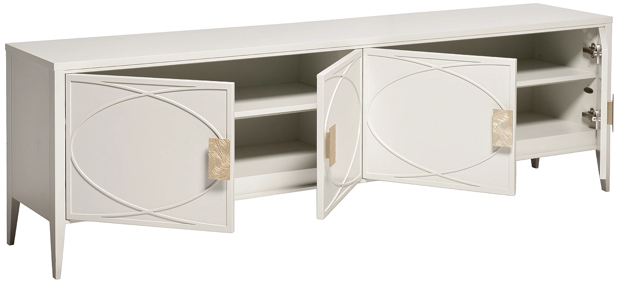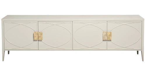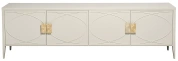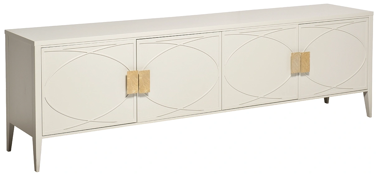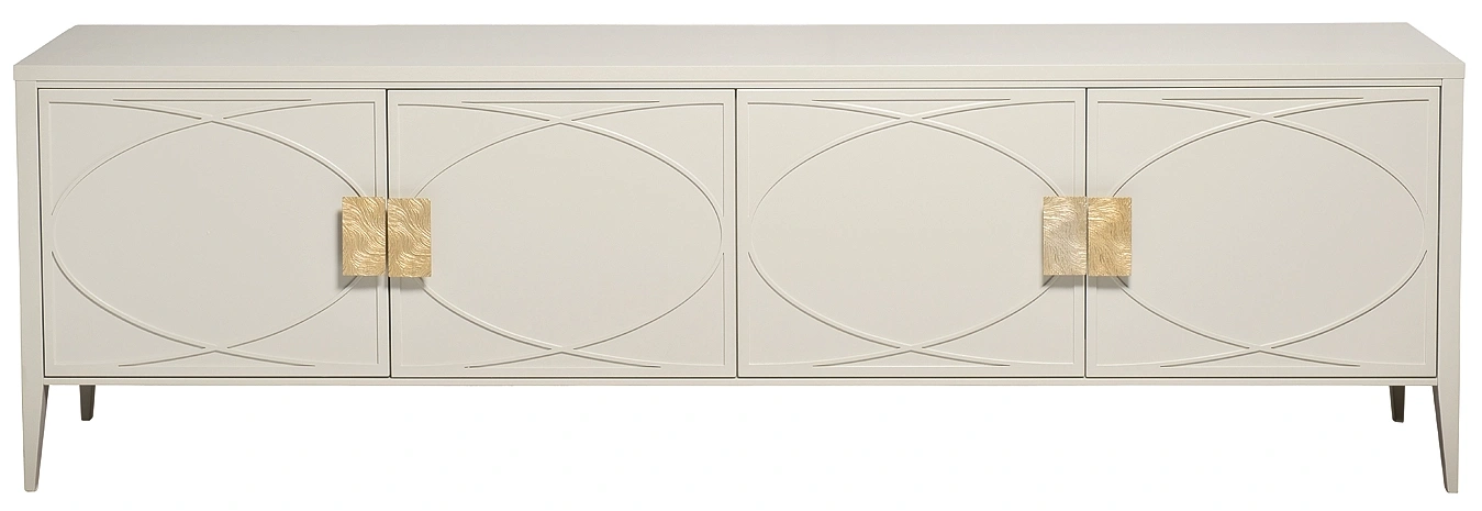Дизайнерская ТВ-тумба в стиле ар-деко - авторская разработка студии Garda Decor. Бежевый матовый фасад украшен объемным дугообразным декором и широкими рельефными ручками золотого цвета(матовое золото). Четыре распашные дверцы открывают доступ к вместительным отделениям с полкой и ящика прекрасно подойдут для хранения столового белья, книг или посуды. Тонкие ножки придают конструкции легкость и изящество. На просторной столешнице можно установить телевизор практически любой диагонали, оборудование для домашнего кинотеатра или аудиосистему. Эксклюзивная ТВ-тумба станет гармоничным дополнением интерьера спальни или гостиной.