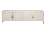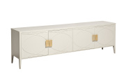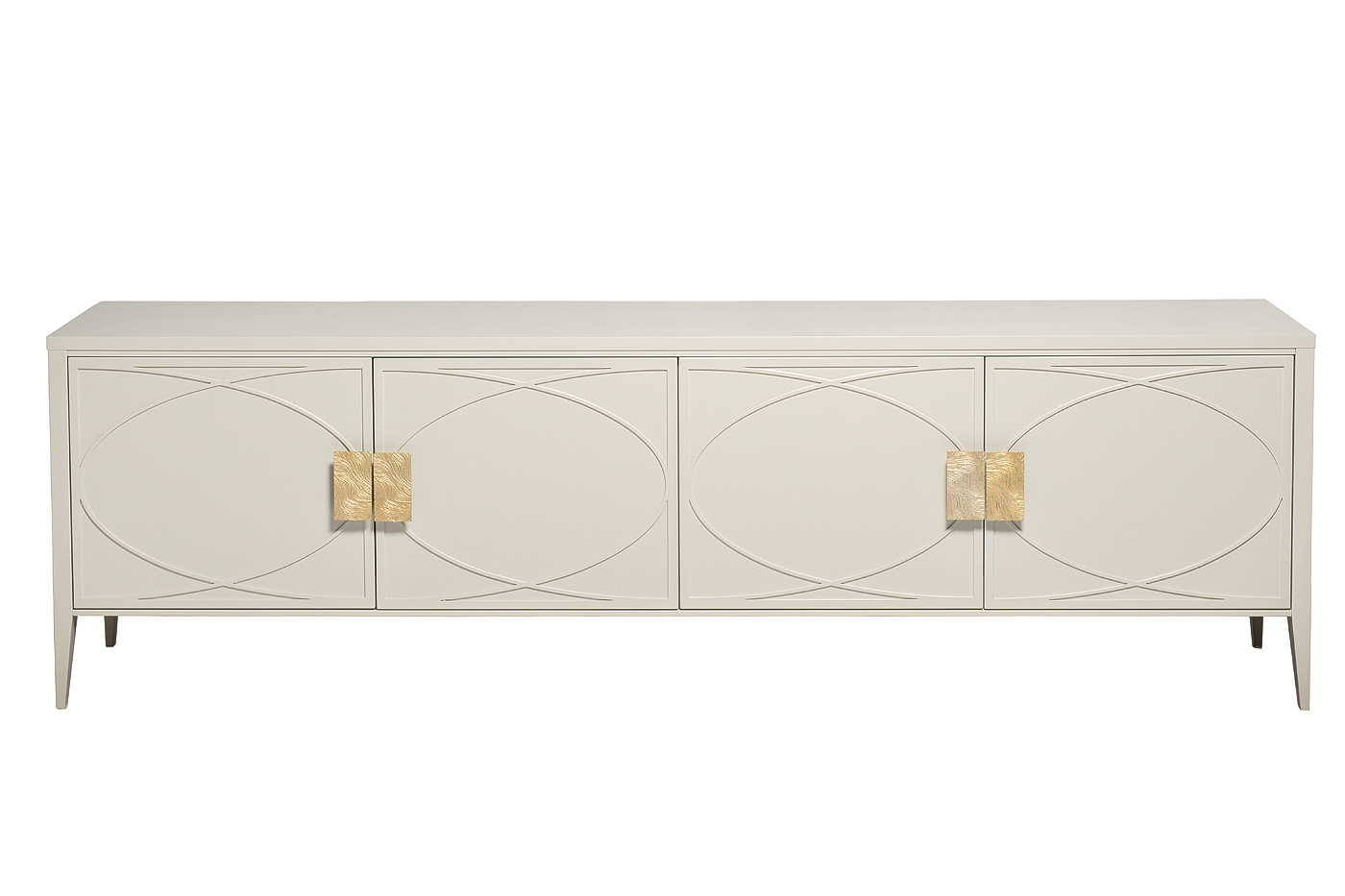 Дизайнерская ТВ-тумба в стиле ар-деко - авторская разработка студии Garda Decor. Бежевый матовый фасад украшен объемным дугообразным декором и широкими рельефными ручками золотого цвета(матовое золото). Четыре распашные дверцы открывают доступ к вместительным отделениям с полкой и ящика прекрасно подойдут для хранения столового белья, книг или посуды. Тонкие ножки придают конструкции легкость и изящество. На просторной столешнице можно установить телевизор практически любой диагонали, оборудование для домашнего кинотеатра или аудиосистему. Эксклюзивная ТВ-тумба станет гармоничным дополнением интерьера спальни или гостиной.