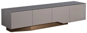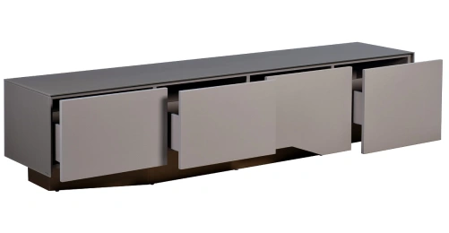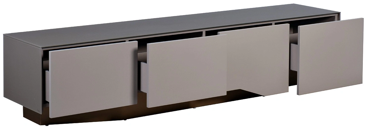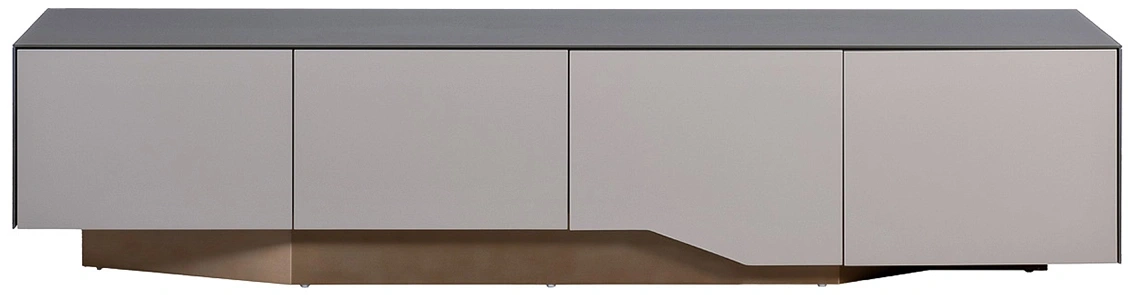 Стильная тумба под телевизор из МДФ, стекла и металла станет изысканным акцентом в современном интерьере. Лаконичный дизайн, основанный на игре фактур и контрасте серого и бронзового цветов, придает модели особый шарм. Тумба под телевизор с выдвижными ящиками — не только стильный, но и практичный предмет интерьера. Вместительные отделения скрывают от посторонних глаз необходимые вещи. Модель органично впишется в обстановку, оформленную в стилистике неоклассики, минимализма или ар-деко.