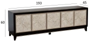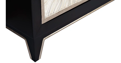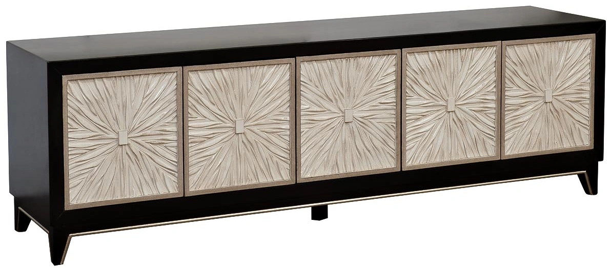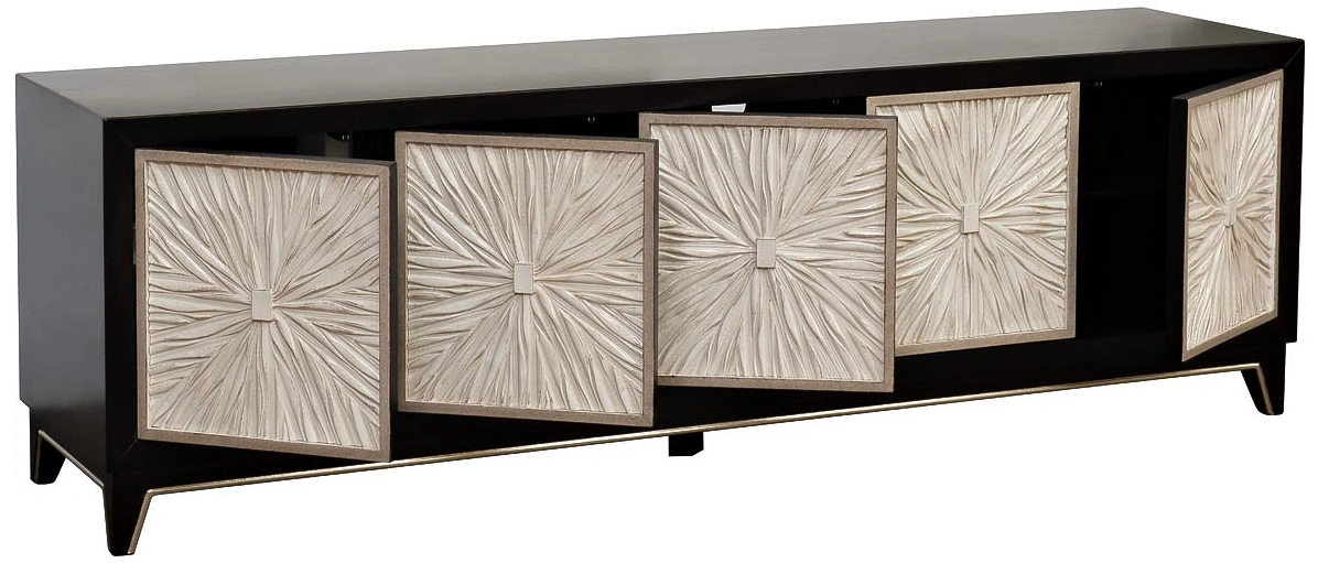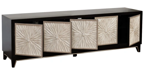 Дизайнерская тумба под телевизор насыщенного оттенка кофе эспрессо с дверцами цвета шампанского украсит вашу столовую, гостиную или спальную комнату. Уникальное покрытие фасада, выполненное вручную по авторской технологии, имитирует мягкие переливчатые складки ткани. Необыкновенное сочетание натурального дерева, металла и полимеров, изысканные цвета, тщательная отделка и многослойная прокраска вручную каждой детали делают тумбу настоящим произведением мебельного искусства. Внутри вместительного шкафа можно хранить диски, книги, посуду или столовое белье. В комплект входит защитная стеклянная столешница. Тумба подходит практически ко всем моделям телевизоров, видео- и аудиосистем; прекрасно впишется в интерьер в классическом стиле, арт-деко, богемный шик или фьюжн.