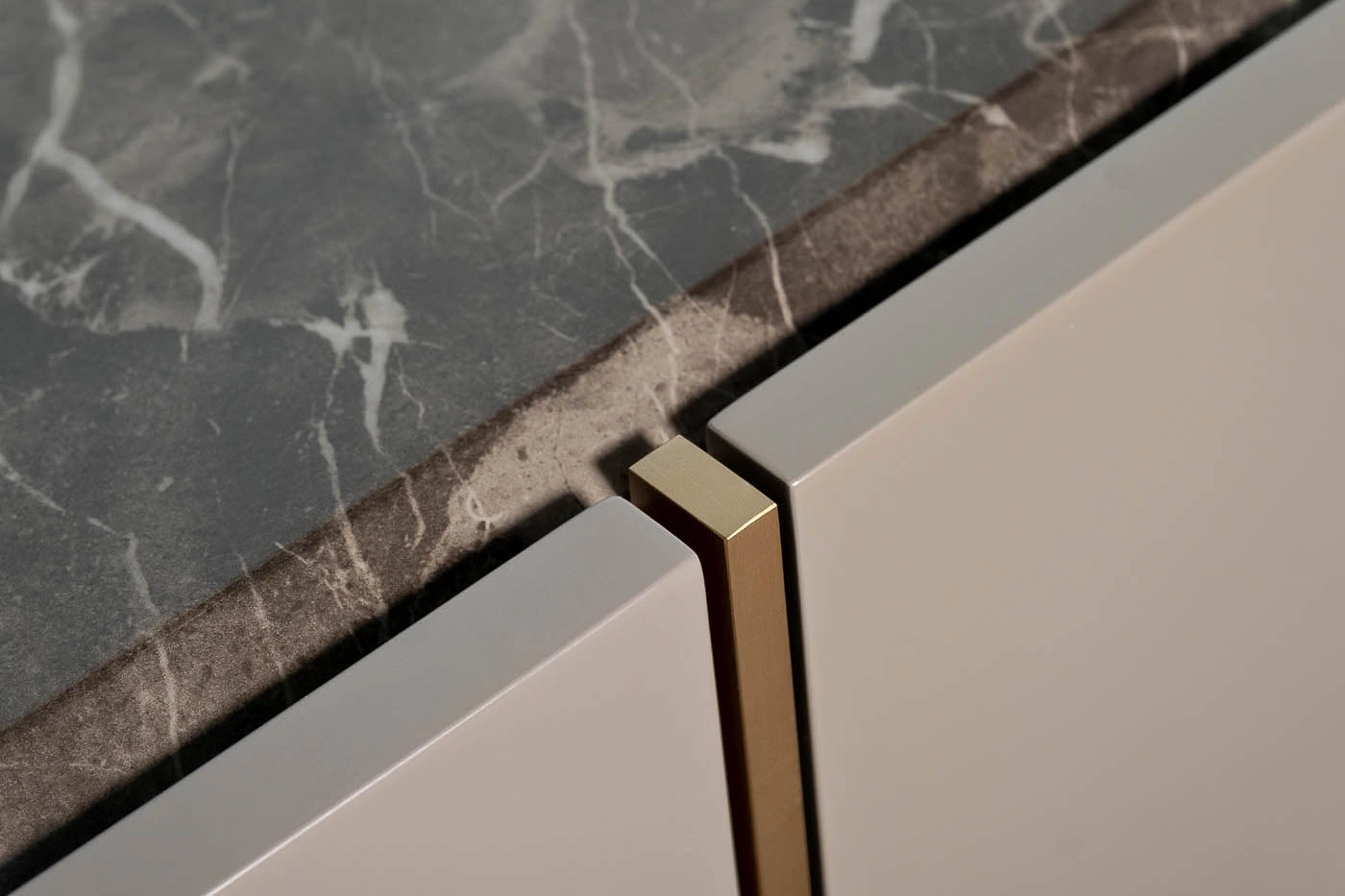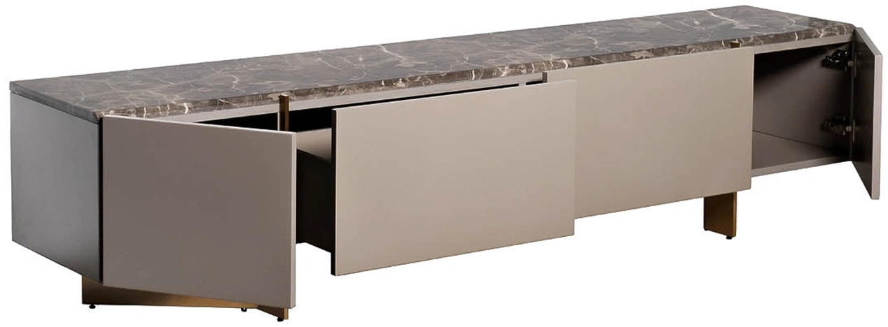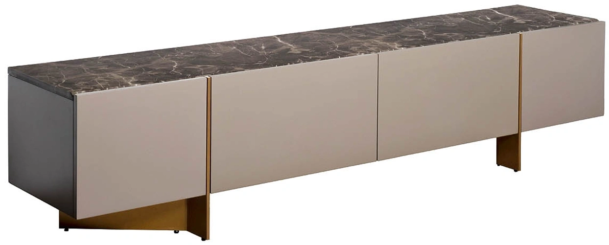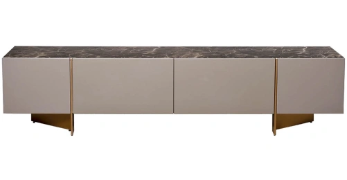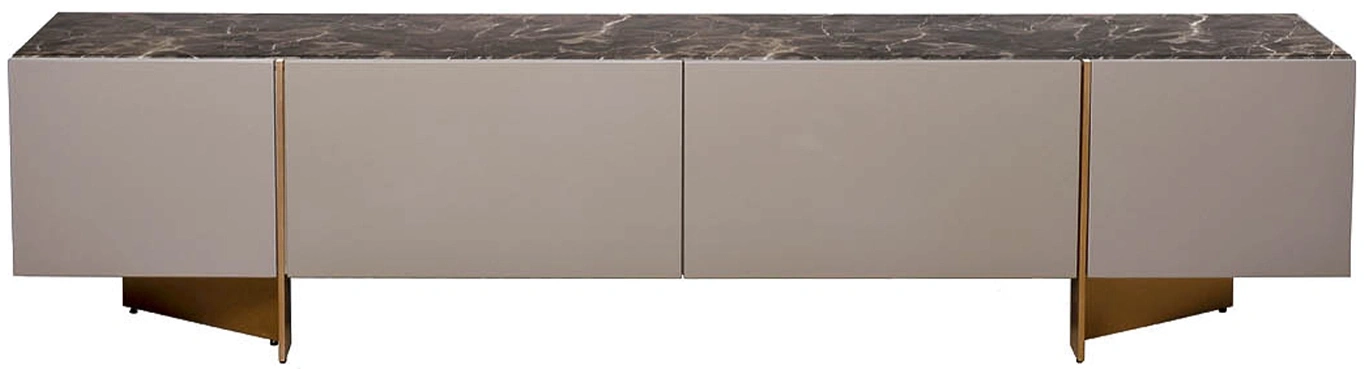 Стильная длинная тумба под телевизор GATE займет достойное место в гостиной или спальне. Это современное удобное решение, которое позволяет организовать хранение вещей, техники и документов. Благодаря нейтральному серому цвету фасадов и лаконичному дизайну тумба под телевизор легко вписывается в интерьер современной гостиной и сочетается с остальной мебелью обстановки. Изюминкой этой модели являются столешница с мраморным рисунком и необычные по форме опоры из металла «под золото». Garda Decor предлагает купить современную тумбу под телевизор, а также другую мебель и декор в стилистике современного ар-деко.