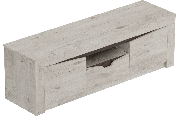 Тумба под ТВ изготовлена из качественных, безопасных материалов, что гарантирует надежность и долговечность изделия. Имеет вместительный выдвижной ящик по центру и два отделения с дверями по бокам.