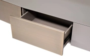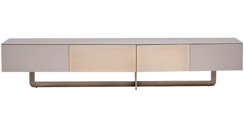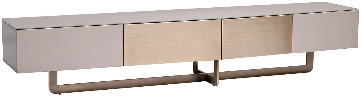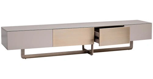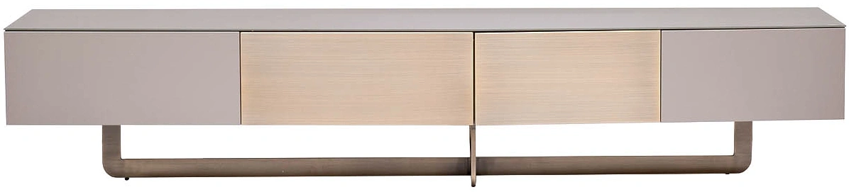 Cуперсовременная тумба под телевизор из мебельной коллекции Space от бельгийского дизайнера Тома Де Вульфа воплощает последние тенденции европейской интерьерной моды. Столешница покрыта закаленным 5мм стеклом. Серый лакированный фасад выполнен из высококачественного МДФ и отделан стальными панелями цвета матовая медь. В тумбе имеется четыре вместительных отделения с выдвижными ящиками. Тумба подходит для установки телевизоров практически любой диагонали. Оригинальная фигурная опора заменяет традиционные ножки, обеспечивая устойчивость и безопасность конструкции даже при полной загрузке полок. Все части тумбы выполнены из исключительно качественных материалов по самым современным технологиям.