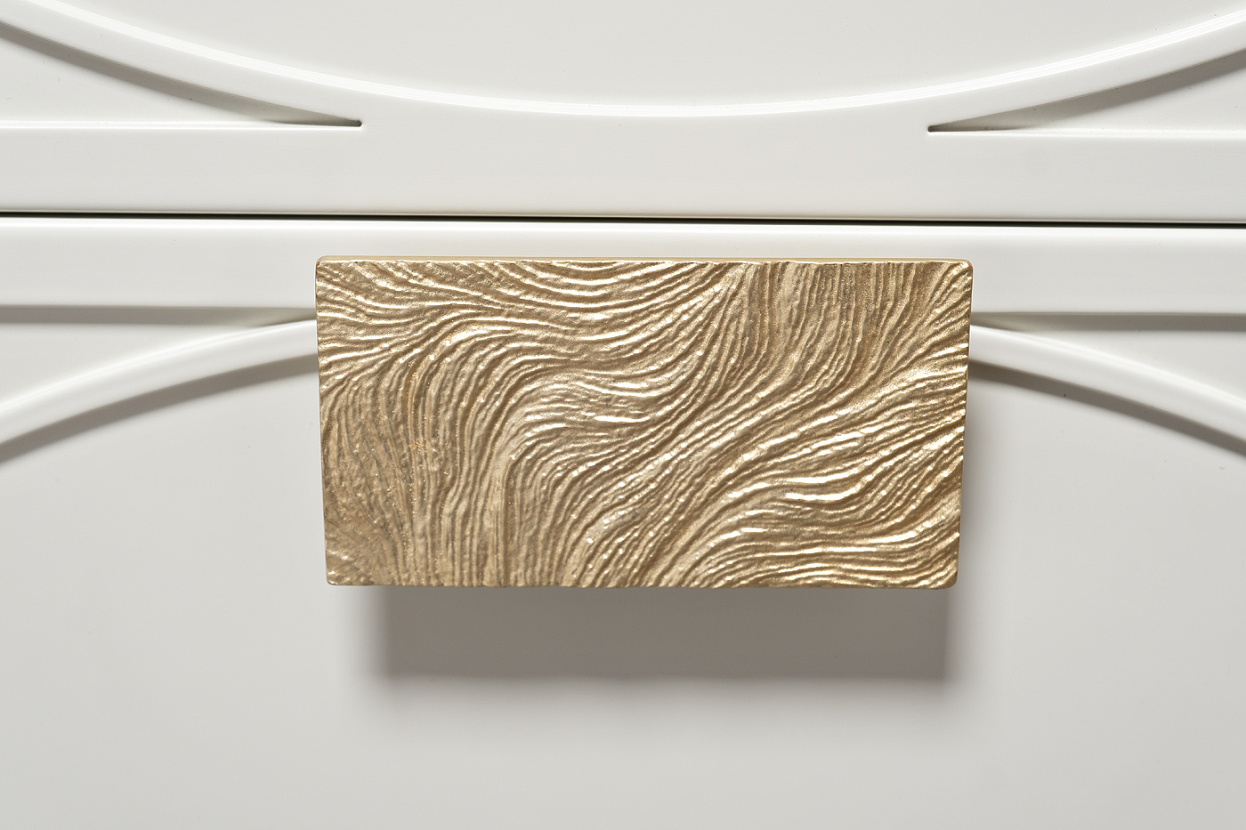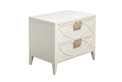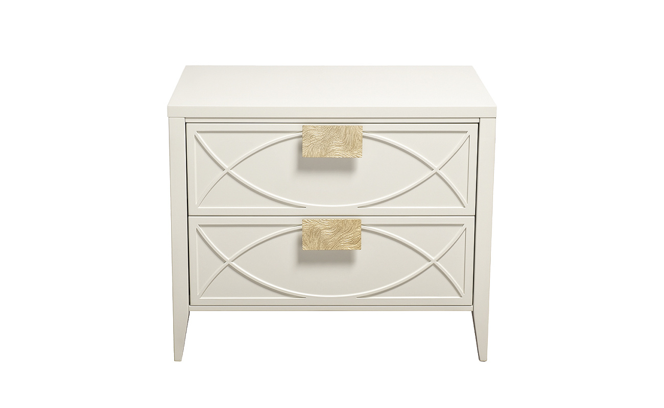 Дизайнерская тумбочка в стиле ар-деко - авторская разработка студии Garda Decor. Бежевый матовый фасад украшен объемным дугообразным декором и широкими рельефными ручками золотого цвета (матовое золото). Два выдвижных ящика прекрасно подойдут для домашней аптечки, хранения белья, щеток, косметики и прочих мелочей. На просторной столешнице будет прекрасно выглядеть одна из настольных ламп в стилистике ар-деко, ассортимент которых широко представлен на нашем сайте. Тонкие ножки придают конструкции легкость и изящество. Эксклюзивная тумбочка станет гармоничным дополнением интерьера спальни, гостиной или прихожей.