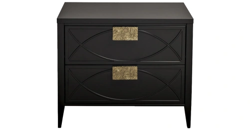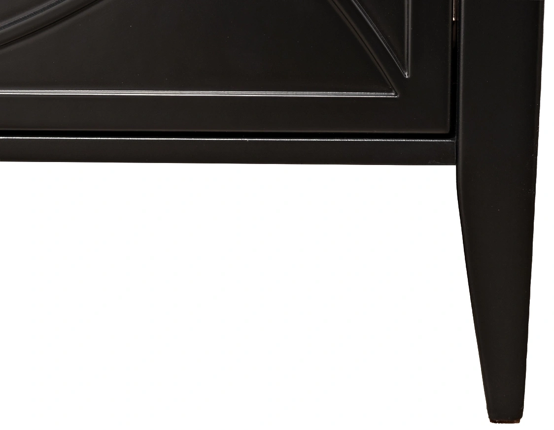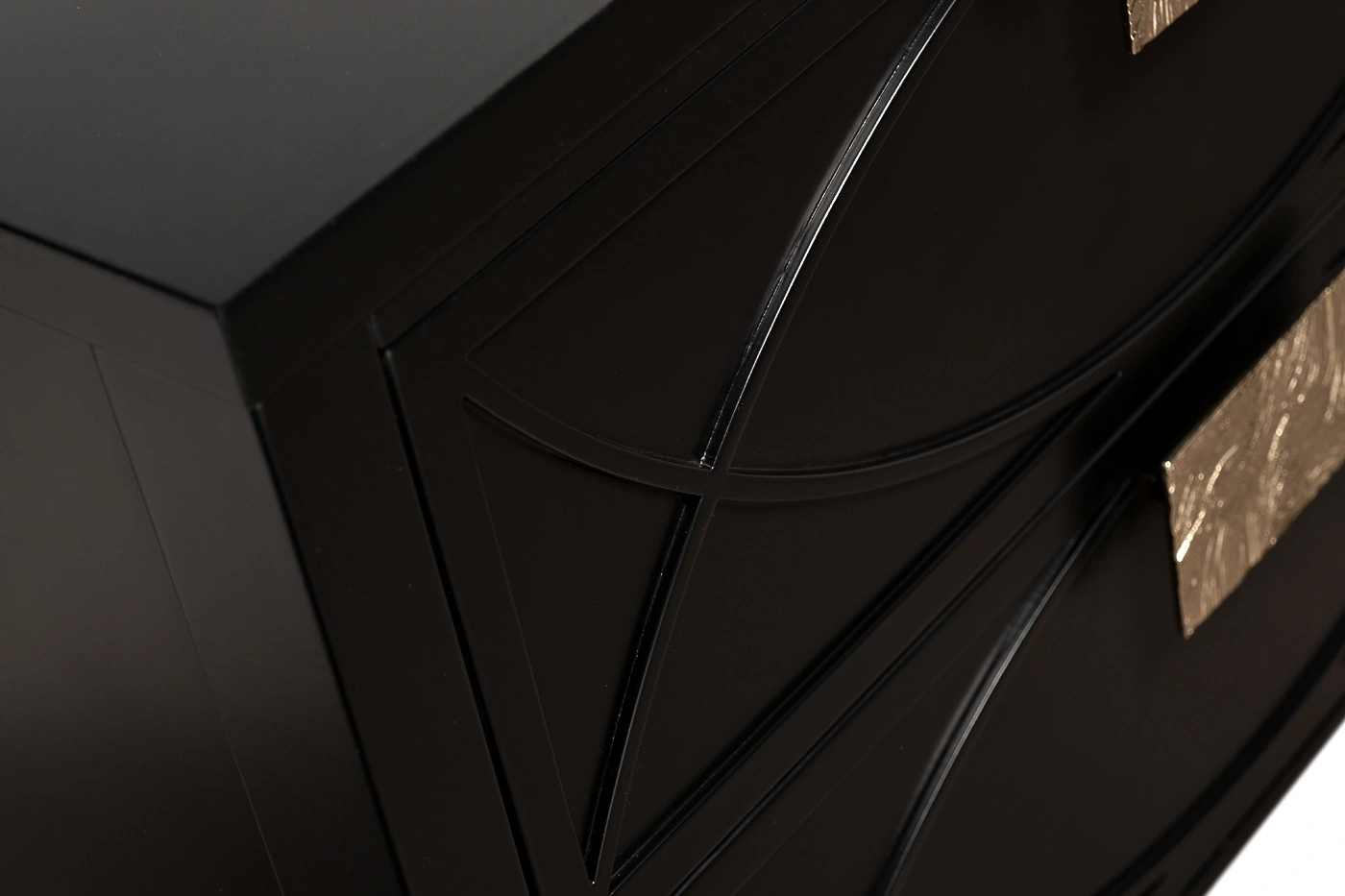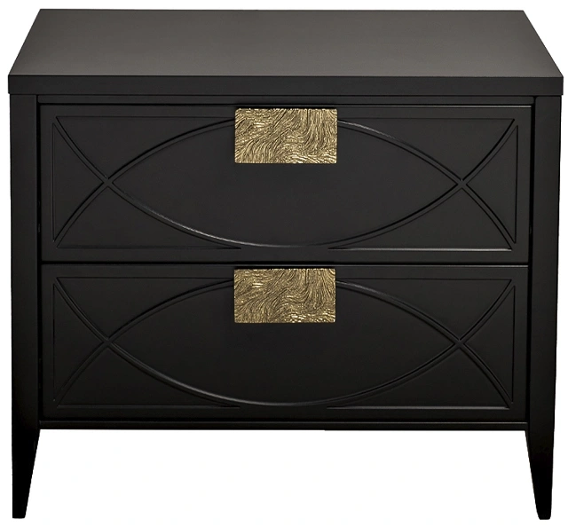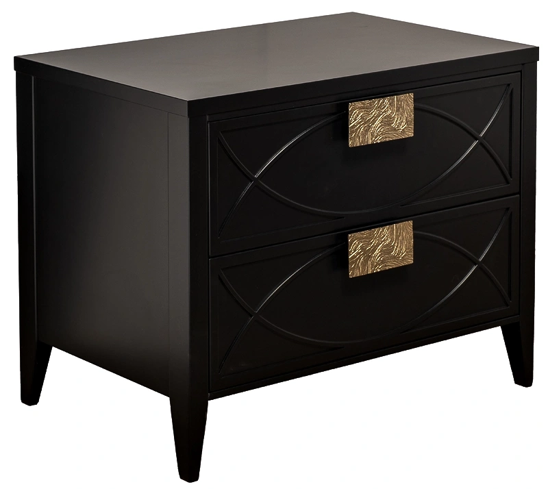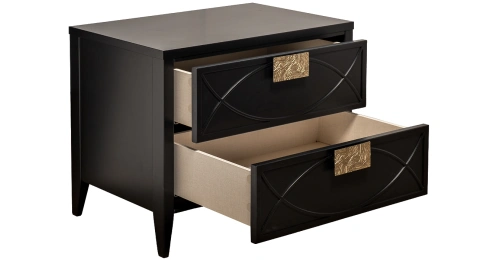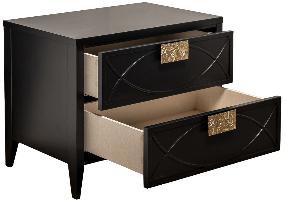 Дизайнерская тумбочка в стиле ар-деко - авторская разработка студии Garda Decor. Черный матовый фасад украшен объемным дугообразным декором и широкими рельефными ручками золотого цвета (глянцевое золото). Два выдвижных ящика прекрасно подойдут для домашней аптечки, хранения белья, щеток, косметики и прочих мелочей. На просторной столешнице будет прекрасно выглядеть одна из настольных ламп в стилистике ар-деко, ассортимент которых широко представлен на нашем сайте. Тонкие ножки придают конструкции легкость и изящество. Эксклюзивная тумбочка станет гармоничным дополнением интерьера спальни, гостиной или прихожей.