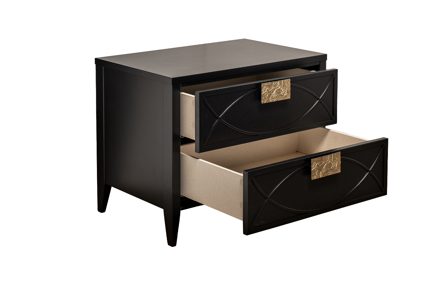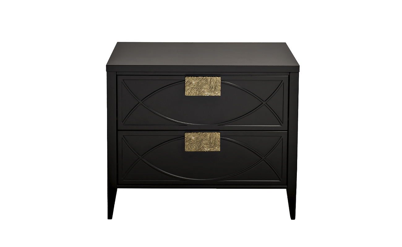 Дизайнерская тумбочка в стиле ар-деко - авторская разработка студии Garda Decor. Черный матовый фасад украшен объемным дугообразным декором и широкими рельефными ручками золотого цвета (глянцевое золото). Два выдвижных ящика прекрасно подойдут для домашней аптечки, хранения белья, щеток, косметики и прочих мелочей. На просторной столешнице будет прекрасно выглядеть одна из настольных ламп в стилистике ар-деко, ассортимент которых широко представлен на нашем сайте. Тонкие ножки придают конструкции легкость и изящество. Эксклюзивная тумбочка станет гармоничным дополнением интерьера спальни, гостиной или прихожей.