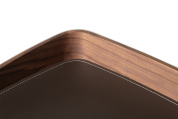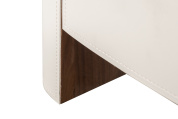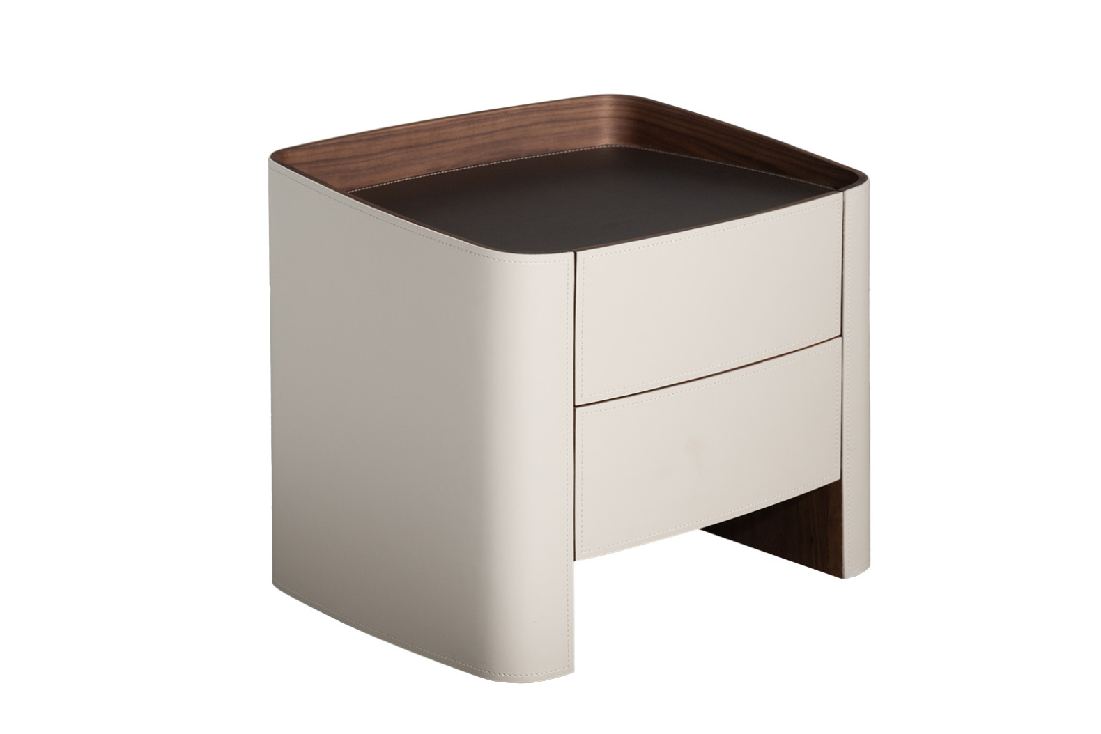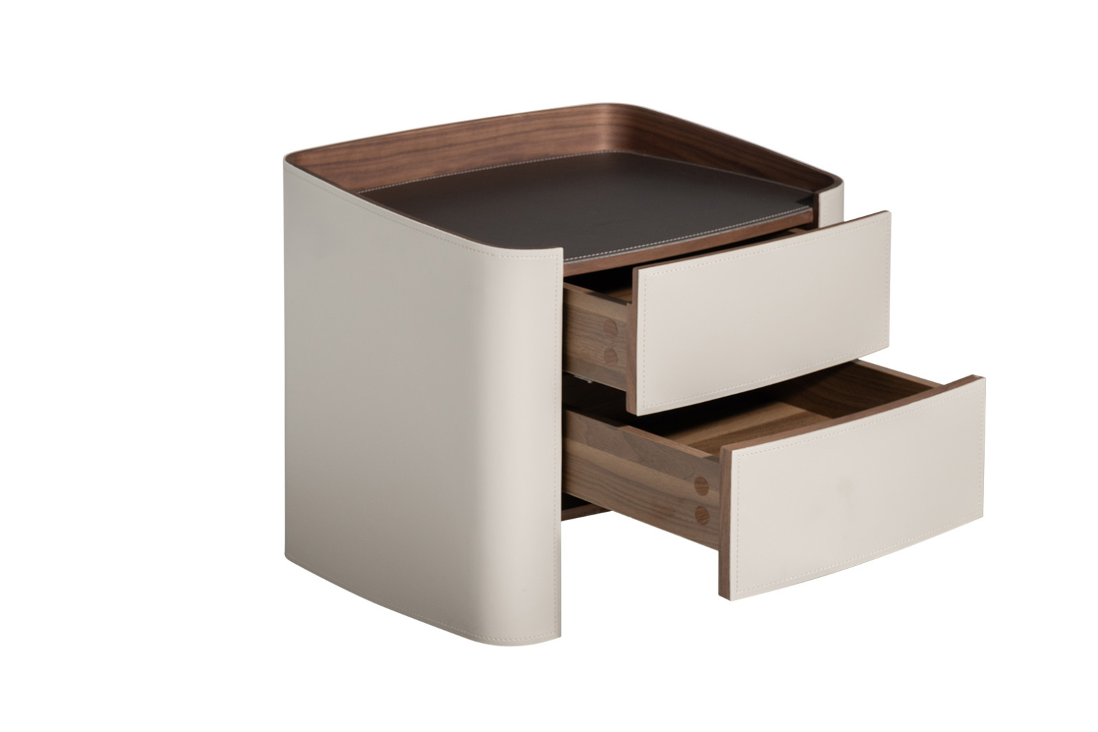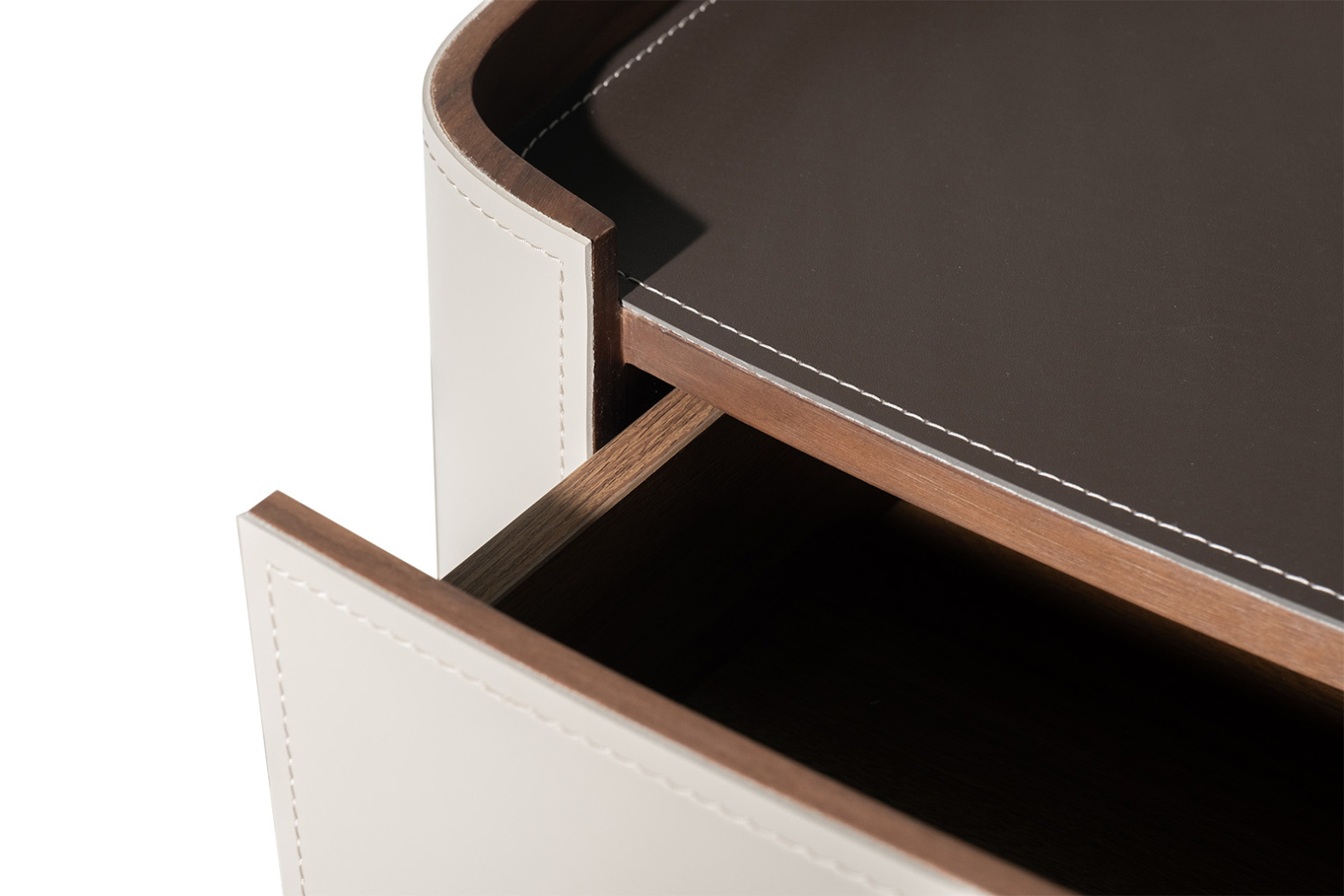 Тумбочка с двумя ящиками в светлом оттенке — утончённый акцент для спальни или гостиной, где важна лёгкость и тактильная теплота. Её корпус обтянут мягкой текстурой, напоминающей кожу, с едва заметной прострочкой по краям — деталь, которая говорит о внимании к мелочам. Верхняя часть с тёмной отделкой создает контраст, добавляя глубину и благородство. Ящики открываются плавно, без ручек — их фасады слегка выпуклые, словно приглашают касаться. Идеальна для интерьеров в стиле ар-деко или фьюжн — где светлая тумбочка становится не просто местом для хранения, а элементом композиции. Это дизайнерская тумбочка, в которой каждая линия продумана: не для глаз — для ощущения. Материалы и форма работают вместе, создавая баланс между уютом и элегантностью.