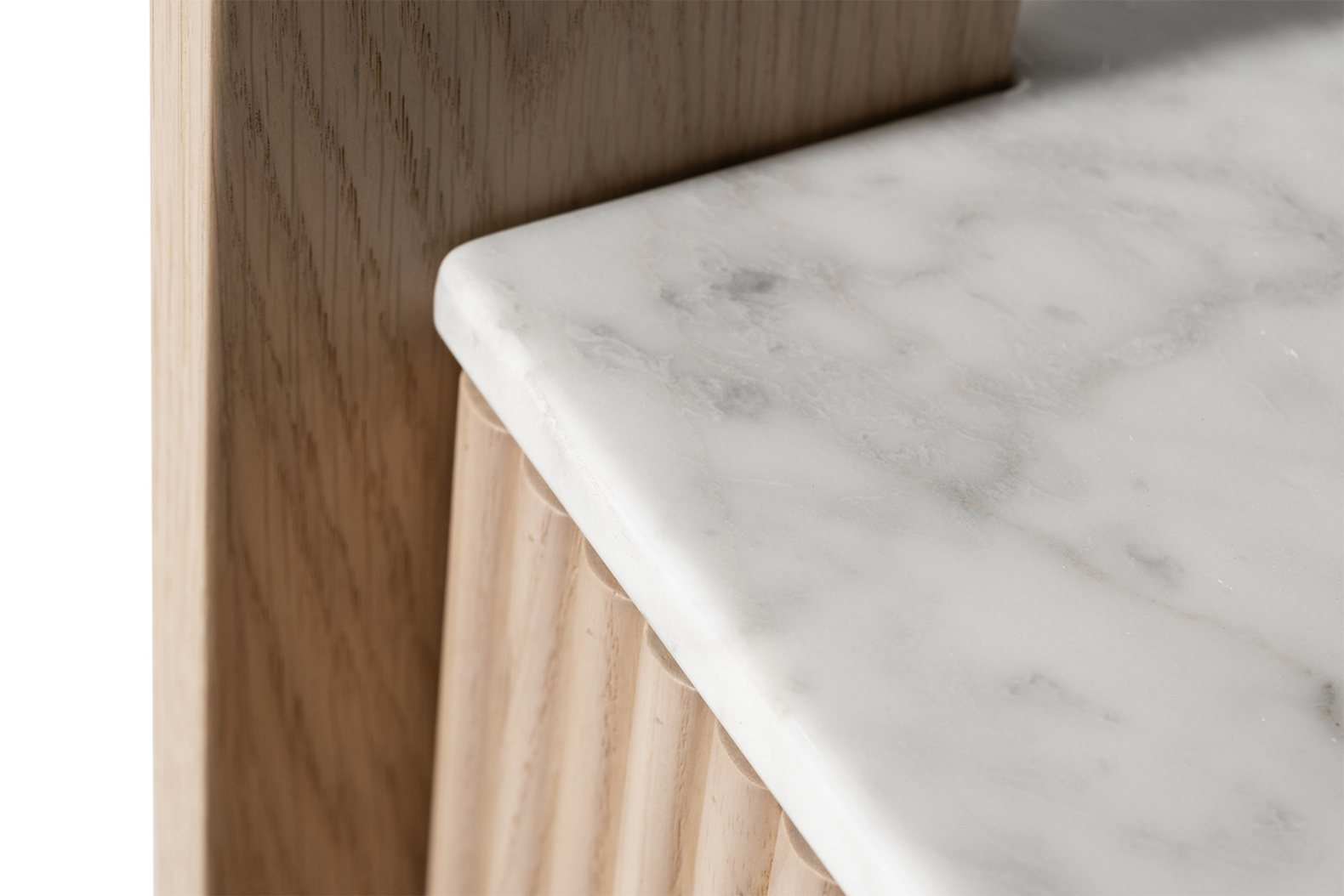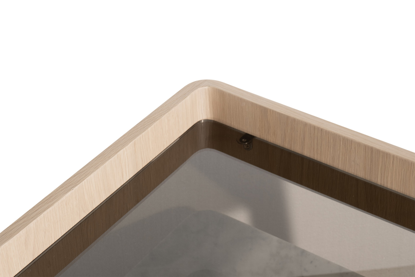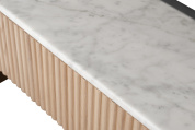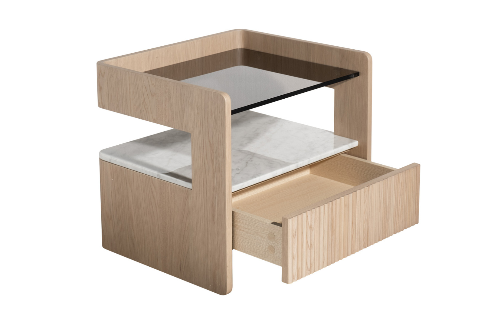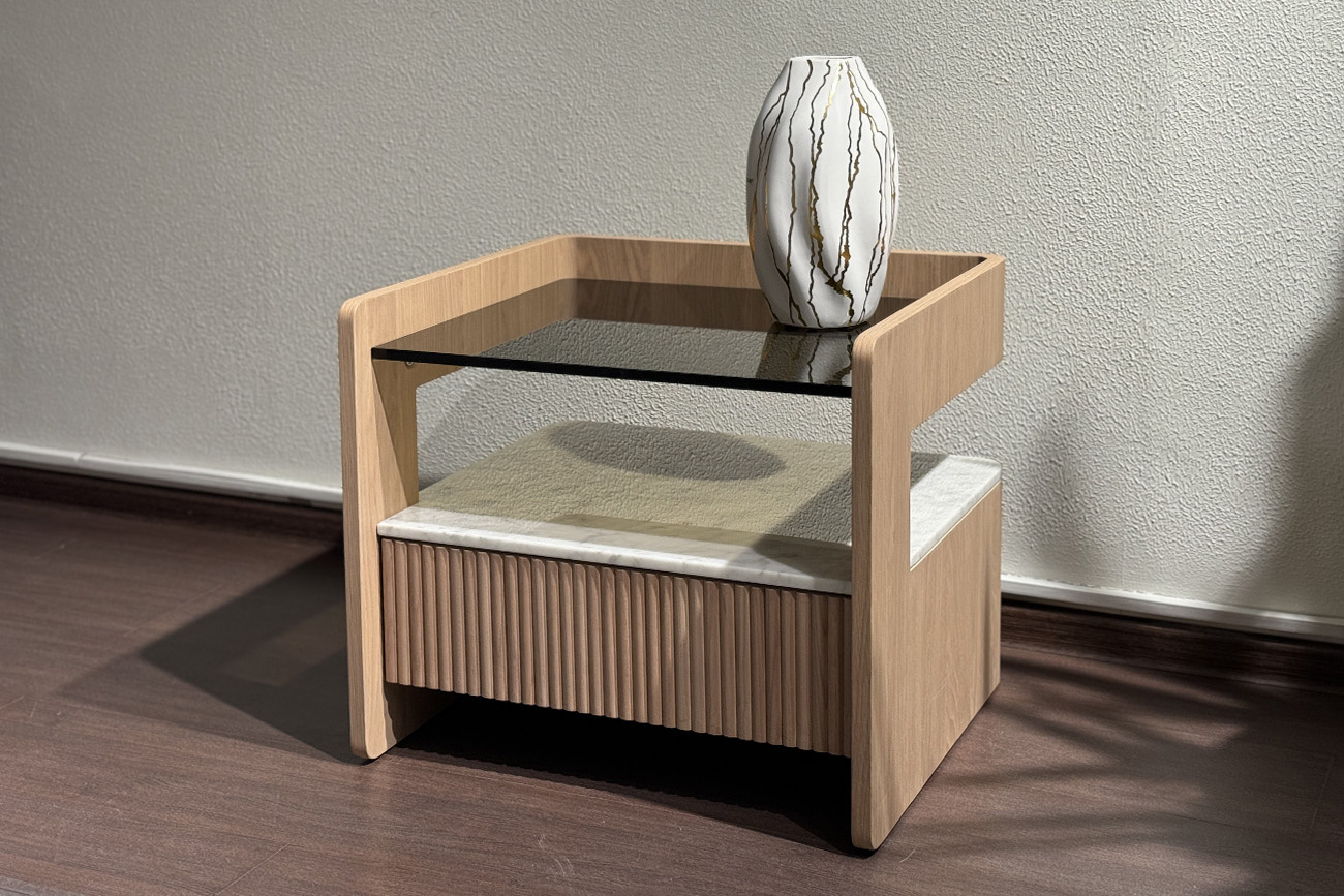 Светлая тумбочка с мраморной столешницей — тонкий баланс между уютом и роскошью. Её корпус из МДФ с текстурой светлого дерева обрамляет полку из прозрачного стекла — лёгкую, будто парящую над основанием. Столешница из натурального мрамора с нежными серыми прожилками уникальна — как отпечаток времени. Ящик спрятан за рельефной панелью, открывается без ручек — плавно, почти бесшумно. Идеальна для спальни или гостиной в стиле ар-деко или фьюжн — где светлая тумбочка с ящиком становится акцентом пространства. Это дизайнерская тумбочка с натуральным мрамором — сдержанная, но выразительная, элегантная без пафоса.