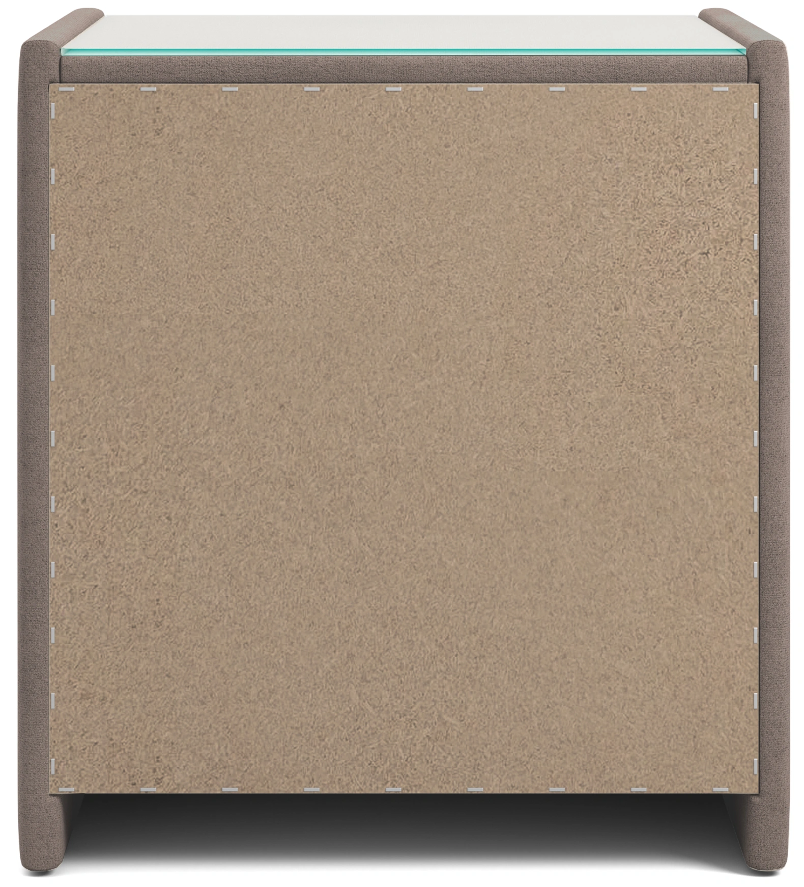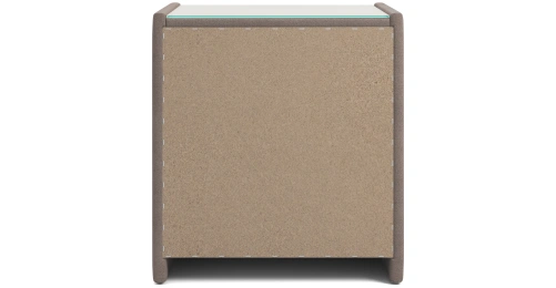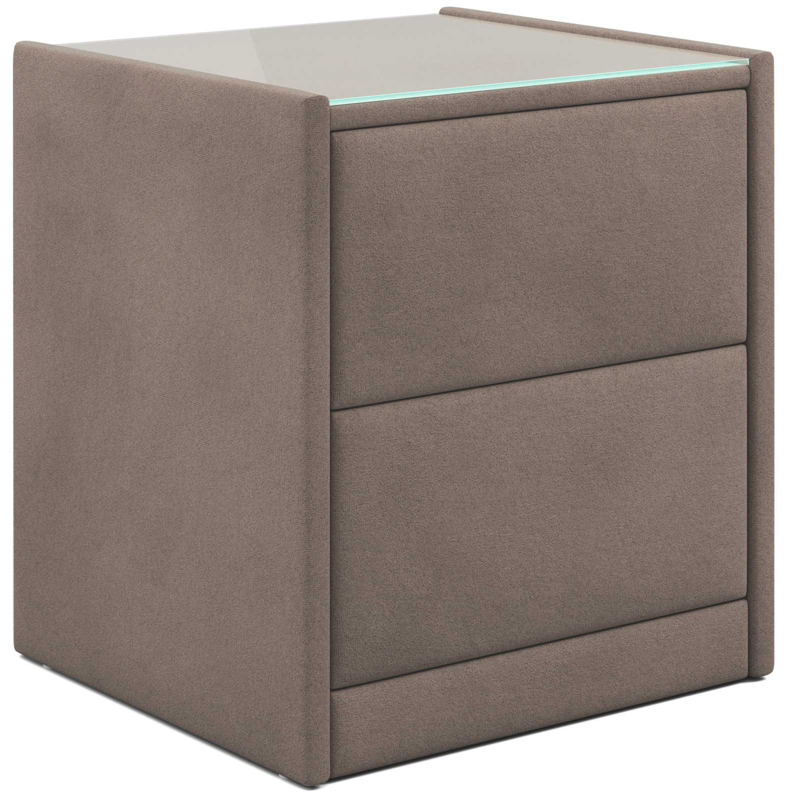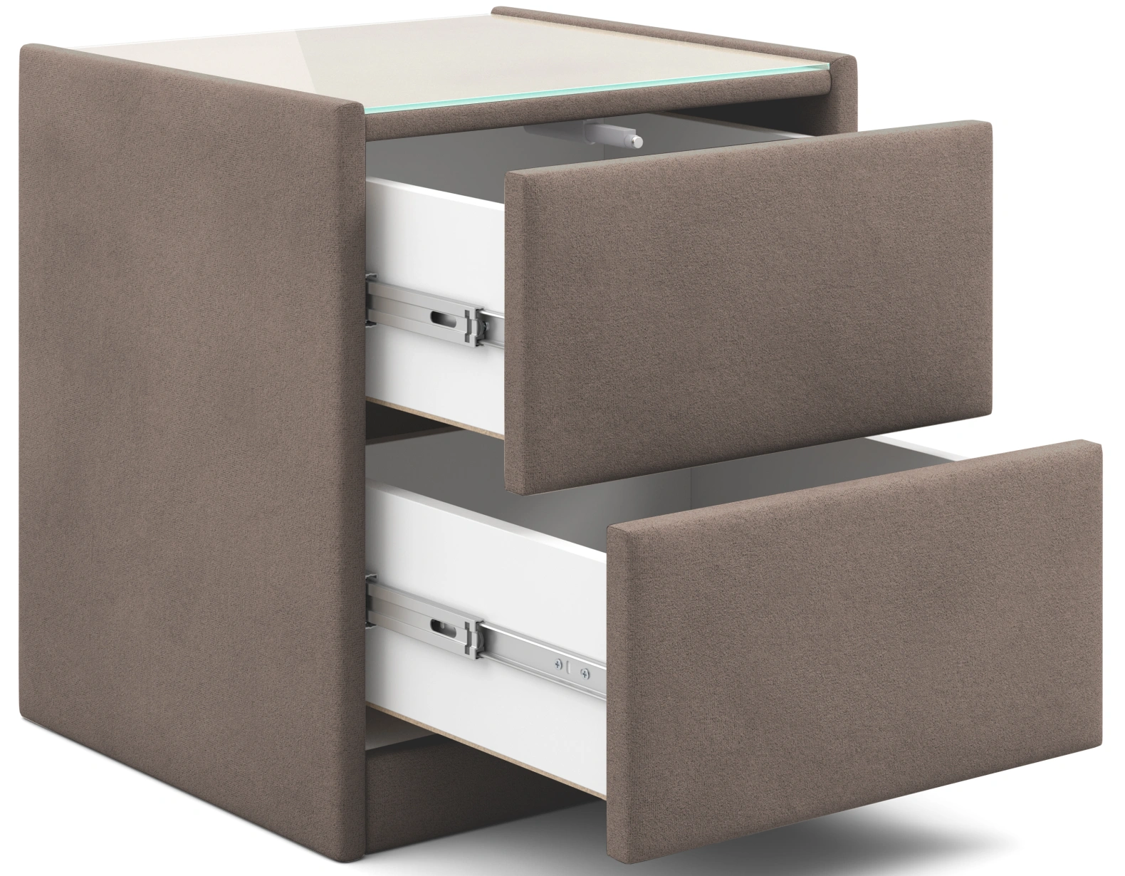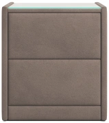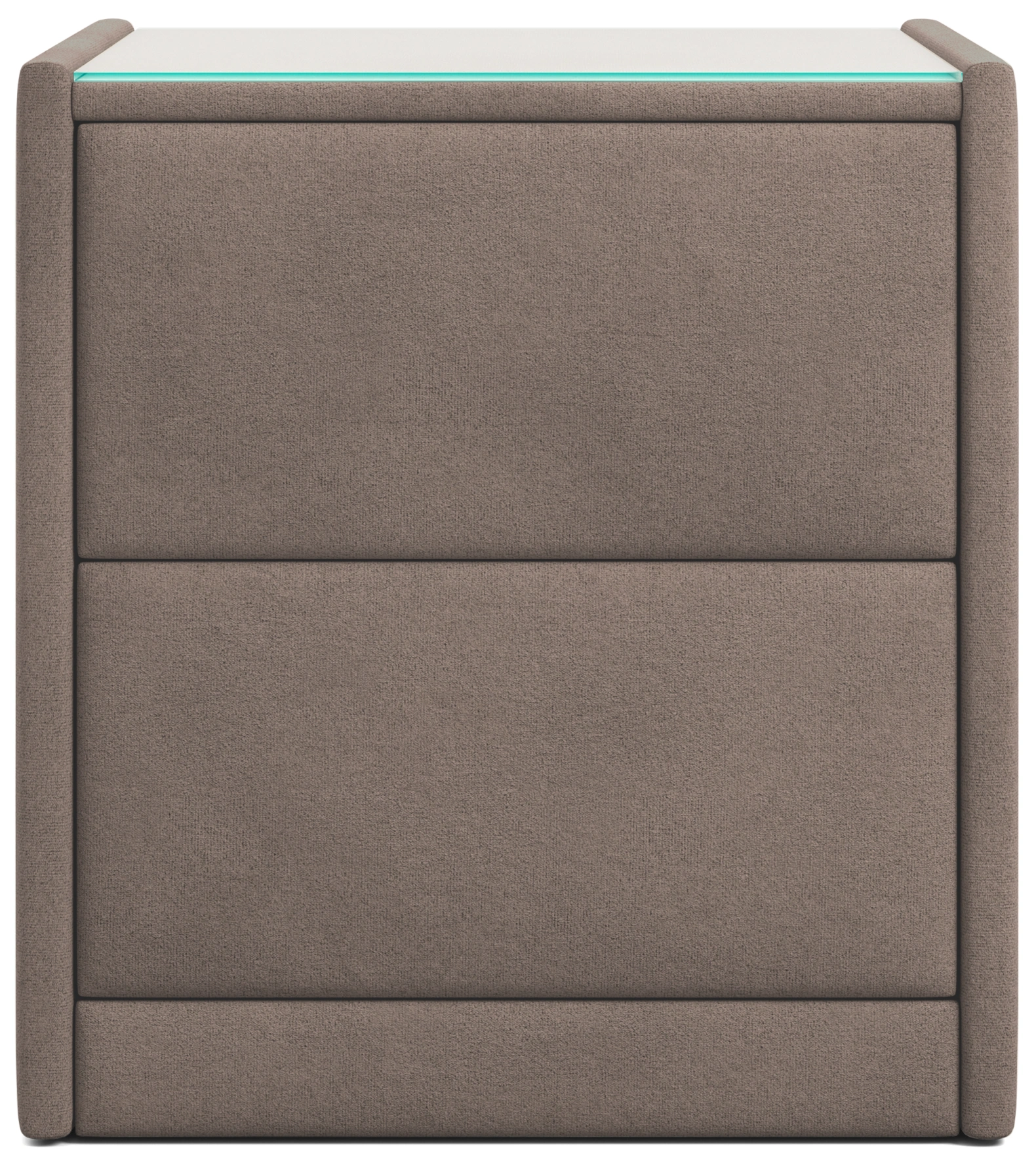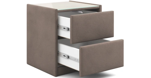 Тумба обтянута высококачественным велюром, что придает ей особый уют и комфорт. Имеет стеклянную столешницу и два вместительных выдвижных ящика с механизмом Push to open. Скругленные торцы модели, минимизируют риск удариться в темноте.