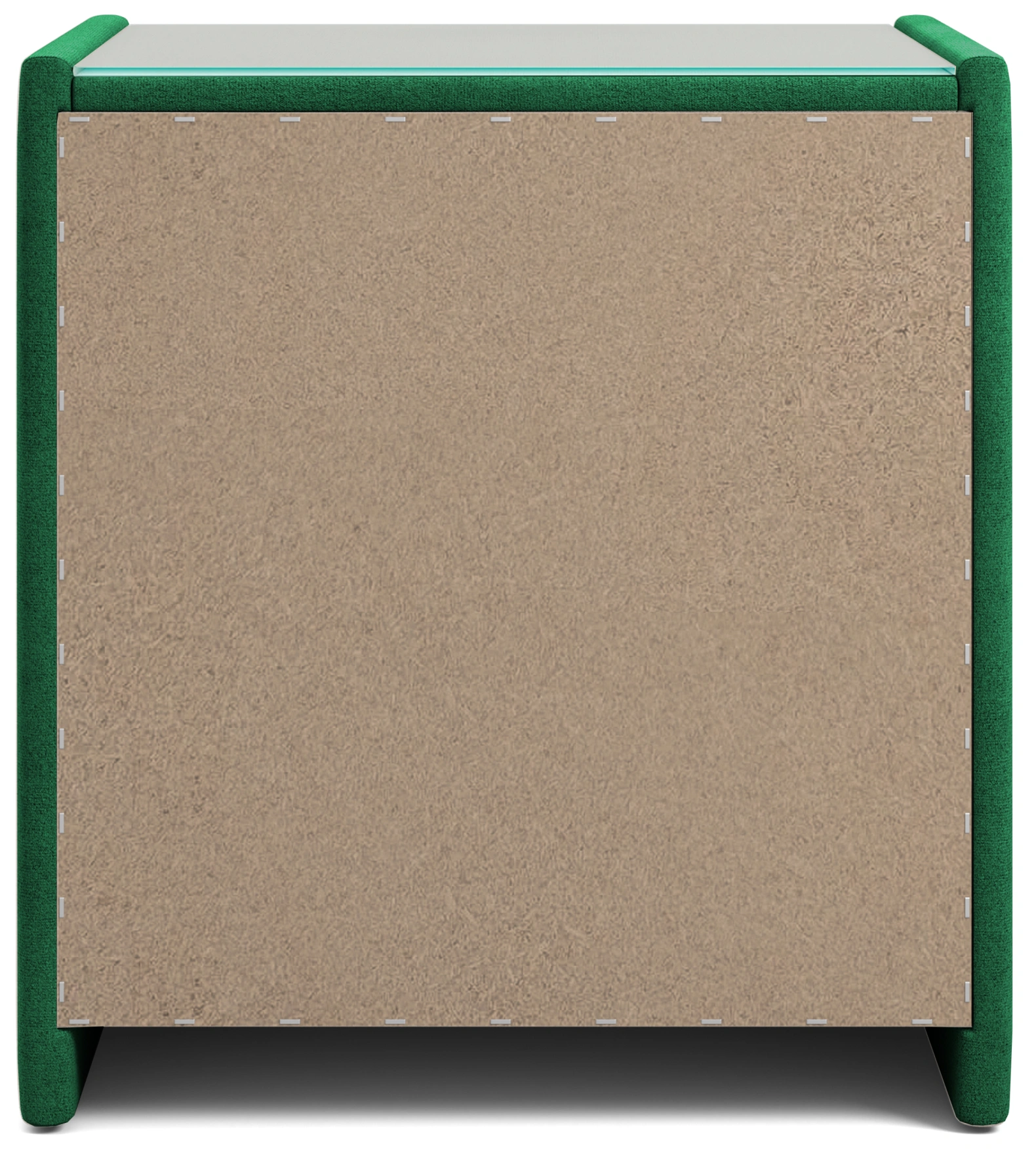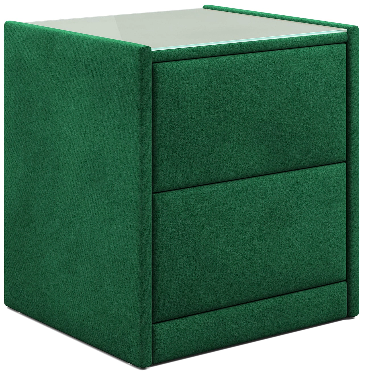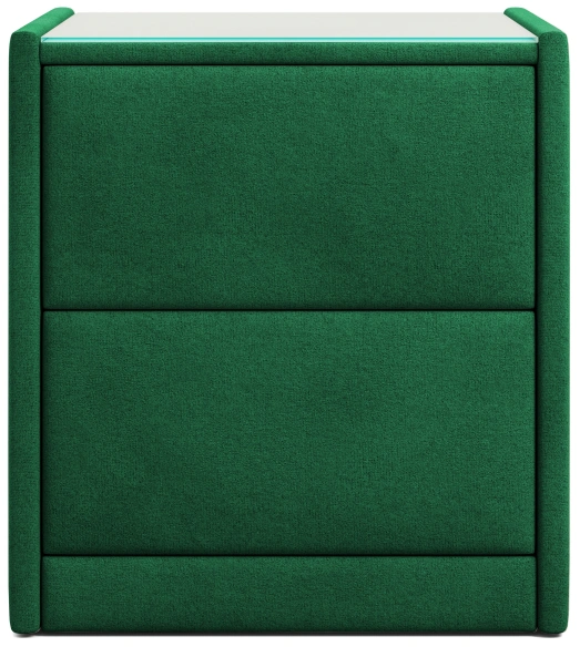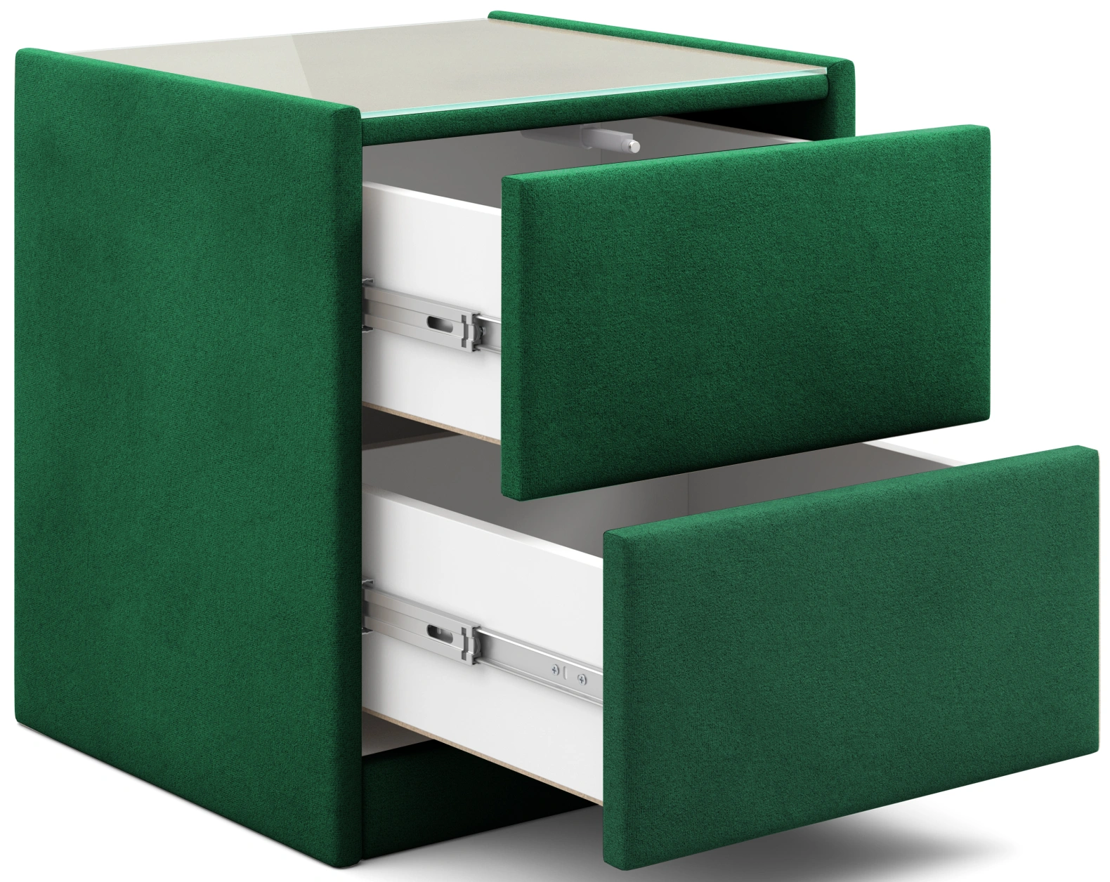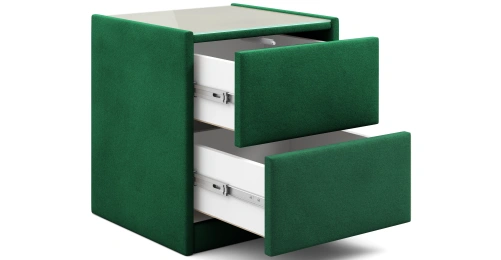 Тумба обтянута высококачественным велюром, что придает ей особый уют и комфорт. Имеет стеклянную столешницу и два вместительных выдвижных ящика с механизмом Push to open. Скругленные торцы модели, минимизируют риск удариться в темноте.