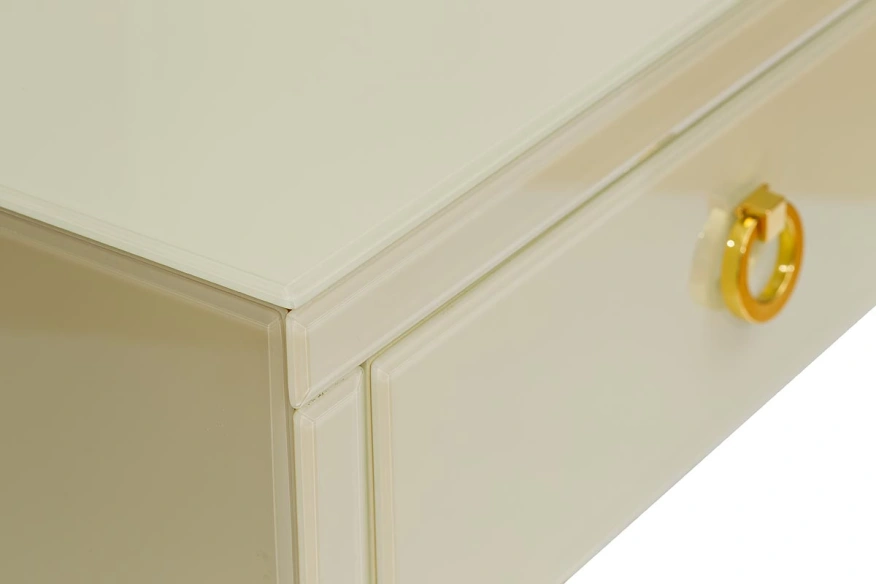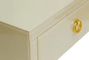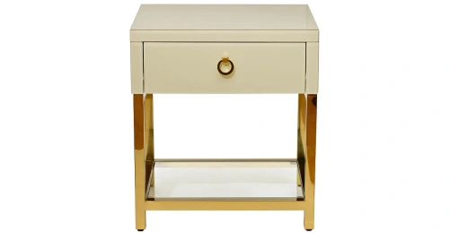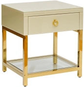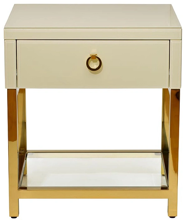 Хорошим дополнением в спальню может стать прикроватная тумбочка с выдвижными ящиком. Эта нежная и светлая мебельная конструкция лучше всего подойдет для комнаты в светлых и пастельных цветовых решениях. Тумбочка – это тот атрибут спальни, который практически не заменим функционально, а дизайнерский вариант сделает его неповторимым элементом интерьера. Выполнена зеркальная тумбочка из бежевого стекла, а ножки и ручки конструкции сделаны из прочного металла с никелированным покрытием в золотистом оттенке. Небольшие размеры бежевой прикроватной тумбочки позволяют вместить изделие даже в маленький угол возле кровати.