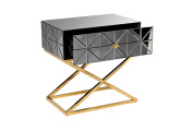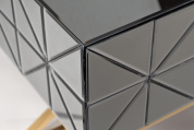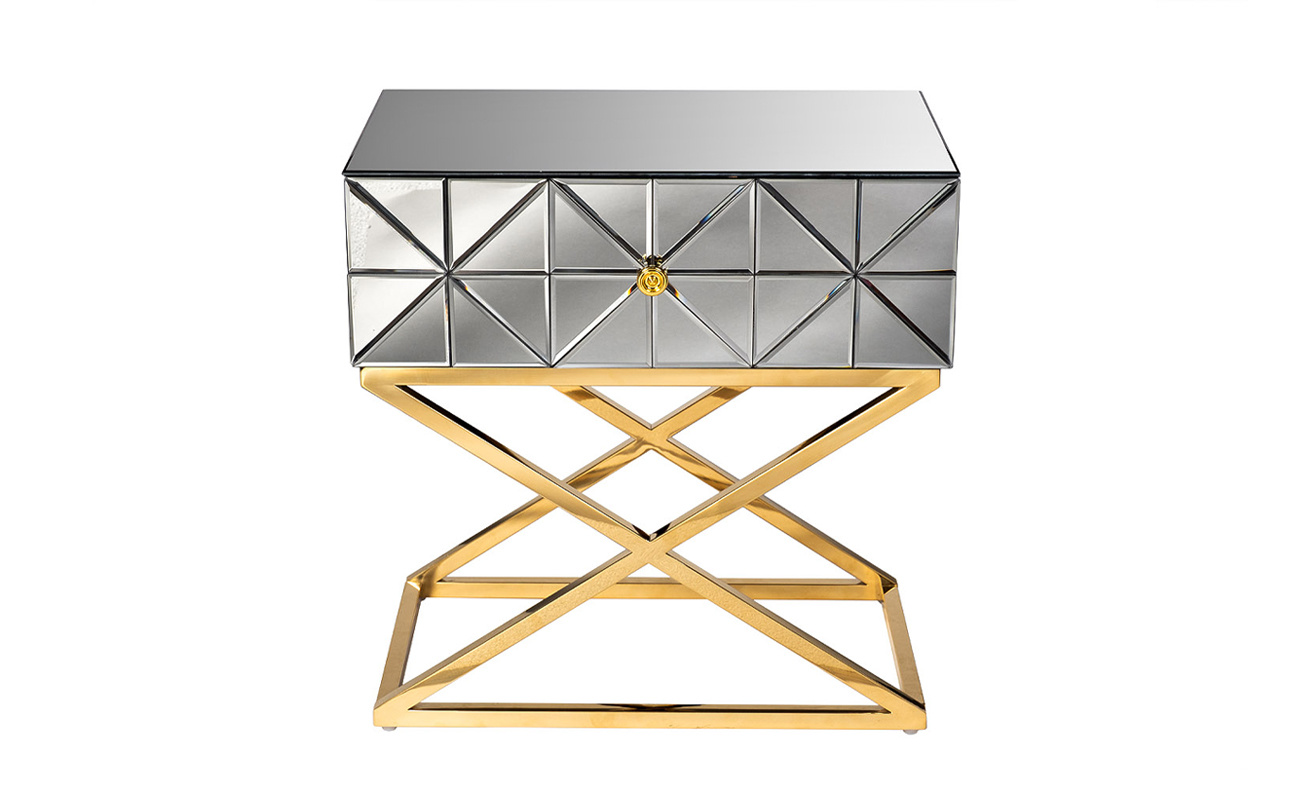 Неординарная тумбочка с выдвижным ящиком дополнит оригинальный интерьер спальни. Поверхность ее фасада собрана из небольших треугольных зеркал, что создает космическое впечатление. Мебель имеет основу из нержавеющей стали цвета золота. Скрещенные ножки гармонично дополняют дизайн зеркальной тумбочки, обеспечивая устойчивость. Представленная модель прекрасно подойдет для интерьера спальни в стиле неоклассики, арт-деко или фьюжн. Тумбочки компактны, поэтому даже в паре не займут много места. А вместительный ящик позволит хранить в нем все, что должно быть под рукой.
