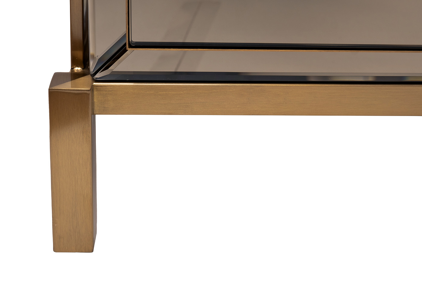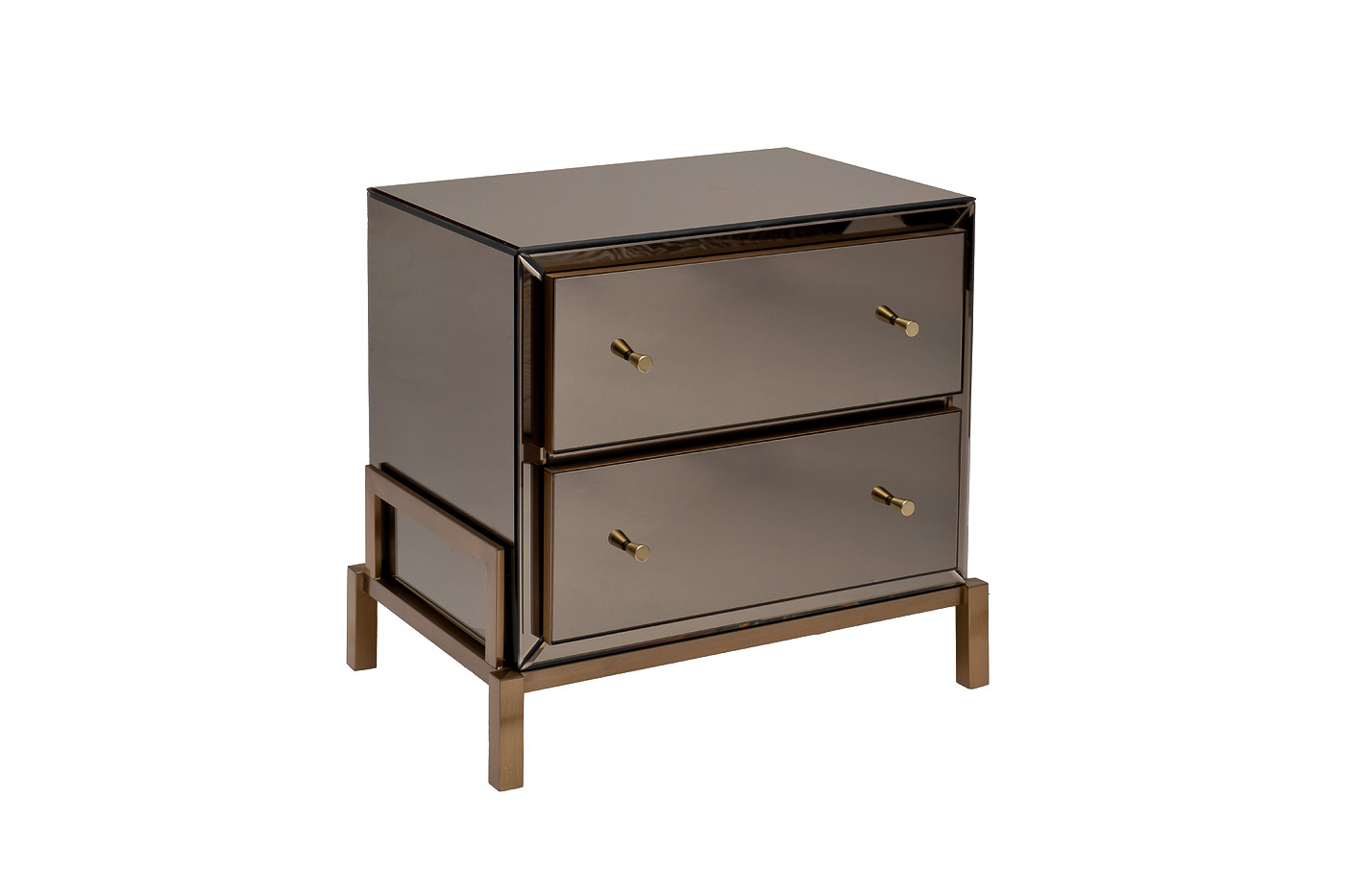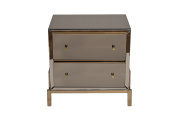 Прикроватная тумбочка под золото добавит нотку аристократизма и изысканной элегантности в обстановку спальни, будуара или гостиной. Особенность данной модели – отделка из зеркала и нержавеющей стали. Дизайнерская тумбочка с двумя ящиками составит стильную компанию кровати, прекрасно впишется в интерьерную стилистику ар-деко, неоклассика, фьюжн. Сочетание матового МДФ, стали и зеркала придает модели особенного шика и делает ее полноценным декоративным элементом интерьера.