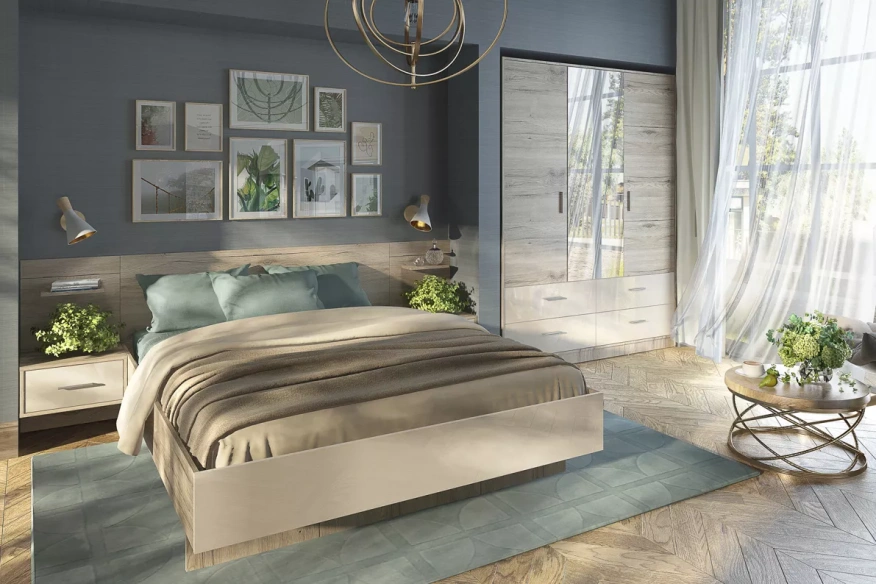Корпус спальни изготовлен из 16 мм ламинированной древесностружечной плиты цвет –«Дуб Санремо» и «Крем Бежевый». Торцевые поверхности корпуса закромлены кромками ПВХ и ABS. Фасады изготовлены из 16 мм ламинированной древесностружечной плиты цвет –«Дуб Санремо» и «Крем Бежевый». По периметру фасады закромлены кромками ПВХ и ABS. Детали, изготовленные из древесностружечной плиты цвет – «Крем Бежевый», обработаны на лаконаливных машинах имеют высоко глянцевую поверхность .