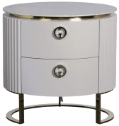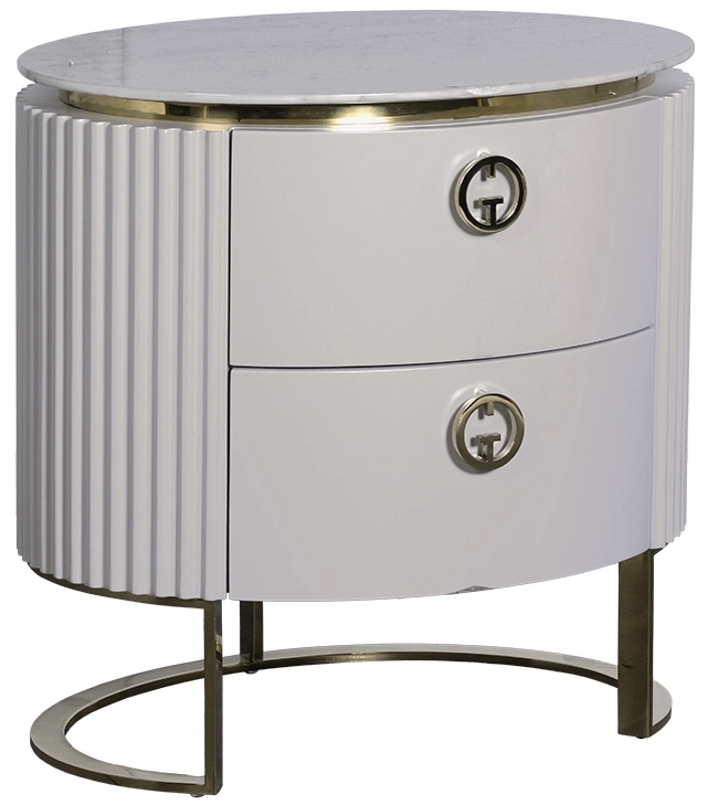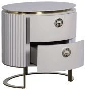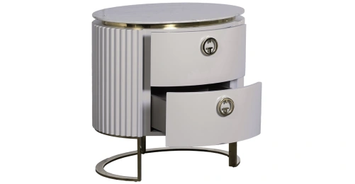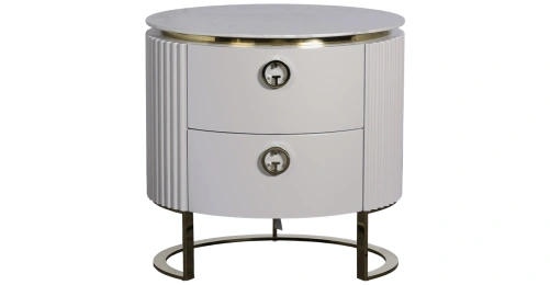 Эффектно завершить дизайн спальни или гостиной поможет тумбочка с мраморной столешницей и вставками из нержавеющей стали под золото. Такая модель отлично смотрится в интерьерах стилей шебби-шик и ар-деко. СВЕТЛО-СЕРЫЙ цвет делает ее универсальным решением, которое можно сочетать как с классической пастельной, так и яркой цветовой палитрой. Прикроватная тумбочка для спальни с оригинальной металлической ножкой в форме полукруга и округлой светло-серой основой наполнит помещение атмосферой уюта и тепла. Выдвижные ящики позволяют спрятать личные вещи и разгрузить комнату. В каталоге со стильной дизайнерской тумбочкой также представлены комод, тумба под телевизор и консоль с мраморной столешницей.