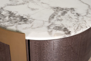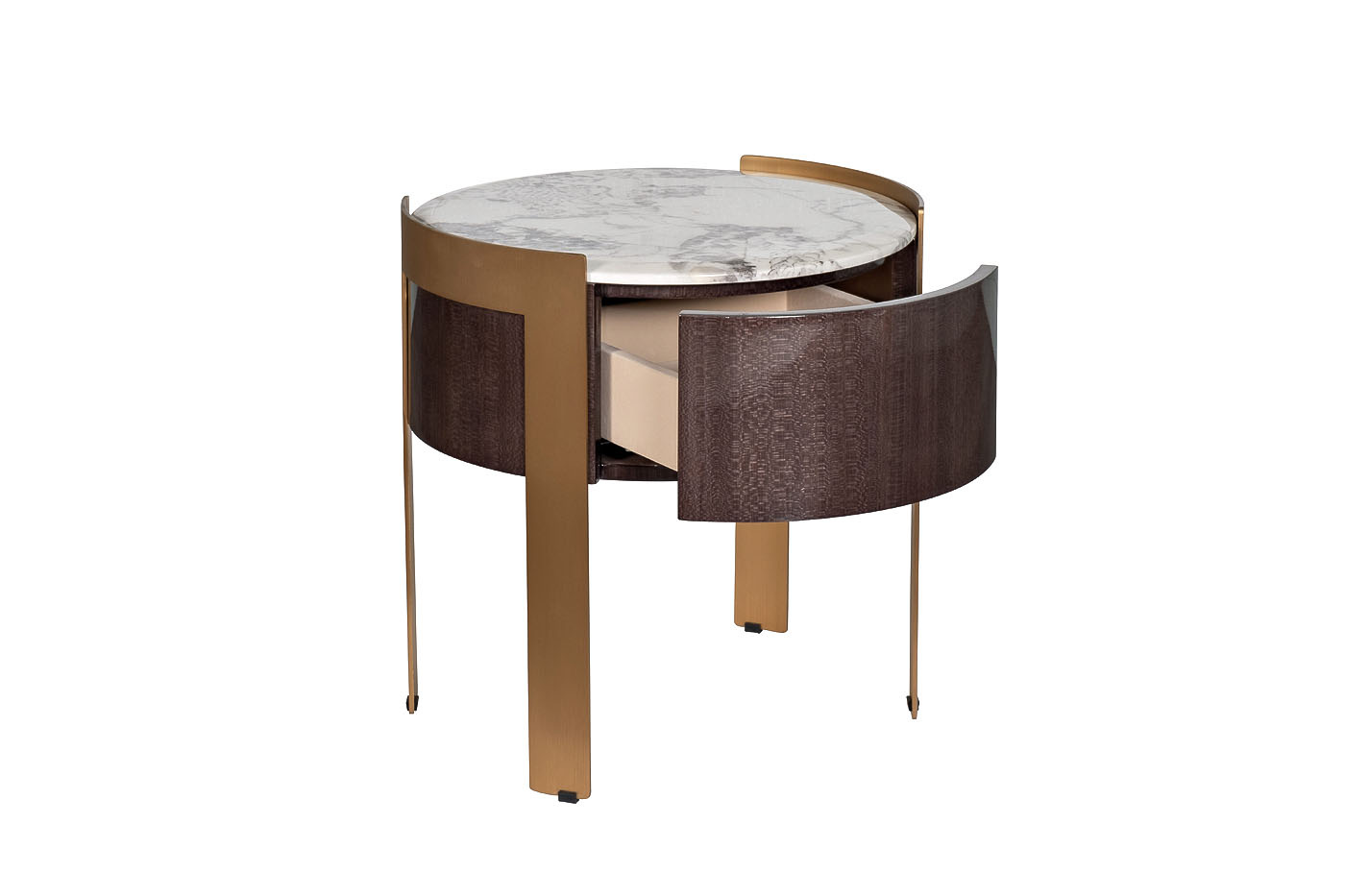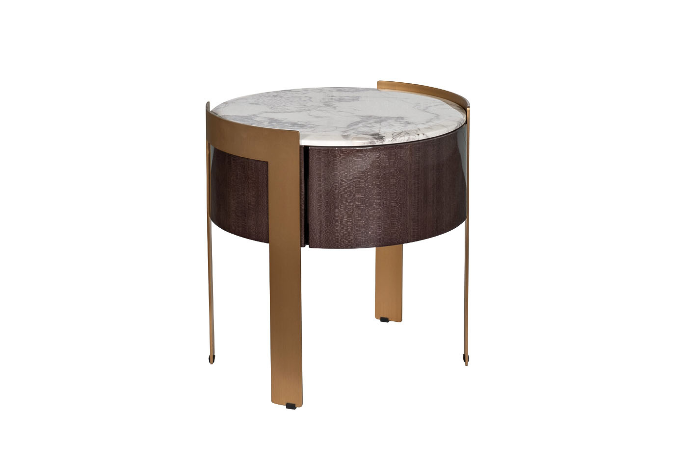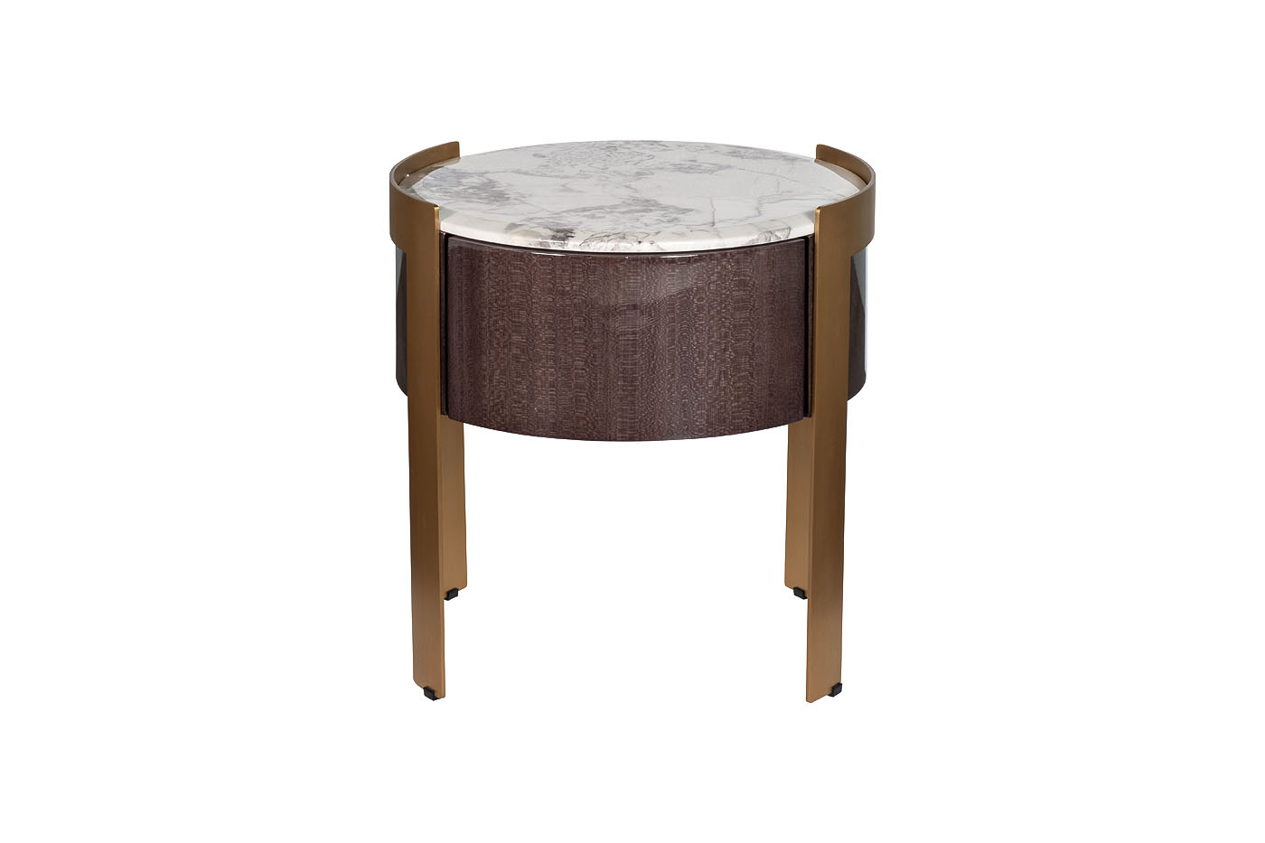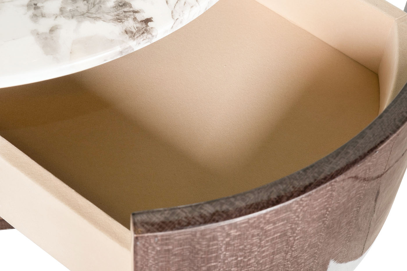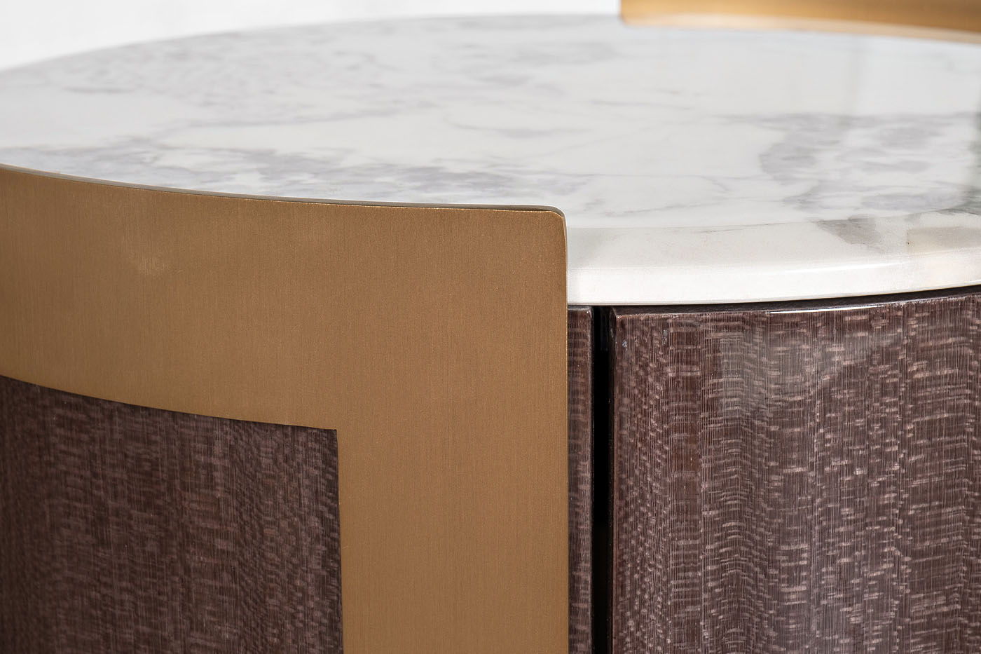 Тумбочка с выдвижным ящиком из коллекции Sevilla, выполненная в изысканных дымчато-серых тонах, сочетает в себе самые последние тренды мебельного дизайна класса «люкс», отделку современными материалами с использованием шпона ценных пород дерева, стали цвета латунь, зашлифованной до сатинового блеска, и искусственного мрамора на основе искусственного камня с пленкой. Элегантные округлые формы, благородство мраморной фактуры, высокое качество исполнения делает предмет коллекции образцовой мебелью для современной обстановки.