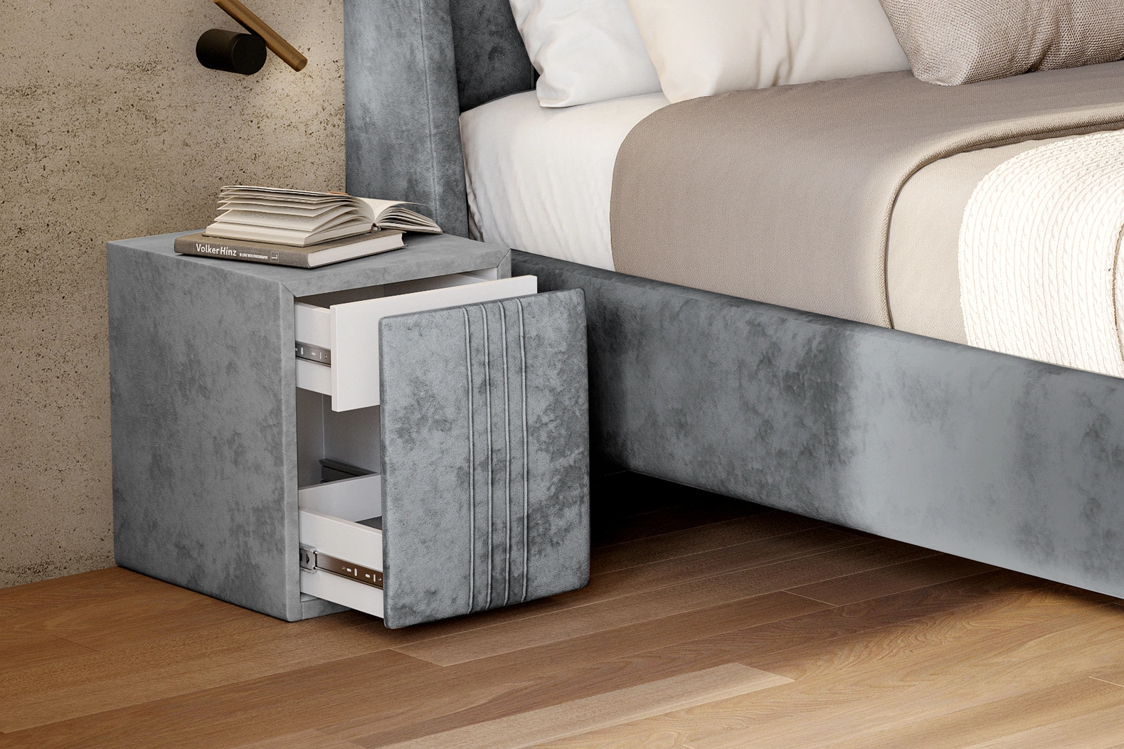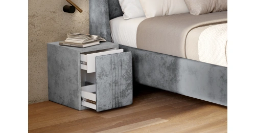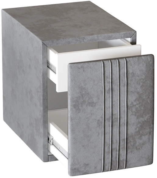 Тумба обтянута высококачественным велюром, имеет два вместительных выдвижных ящика с механизмом push to open. Скругленные торцы модели, минимизируют риск удариться в темноте.