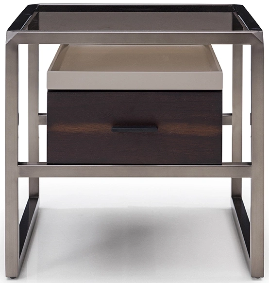 Современная прикроватная тумбочка, в которой геометрия форм и текстуры материалов создают выразительный интерьерный акцент. Комбинация тёплого дерева, стеклянной столешницы и металлического каркаса придаёт ей брутальную элегантность и утончённость. Эта тумбочка станет не просто функциональной частью спальни, а стильным элементом обстановки в духе минимализма, лофта или неоклассики. Идеальна для хранения мелочей и создания завершённого образа интерьера.