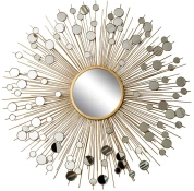 Хит продаж! Оригинальное декоративное зеркало гармонично впишется в современный интерьер спальной или гостиной. Центральное зеркало диаметром 25см окружено множеством золотистых "солнечных" лучей с маленькими зеркальцами. Естественный или искусственный свет, падающий на зеркальные поверхности, преобразуется в целую россыпь искрящихся бликов и солнечных зайчиков, создающих в комнате легкое весеннее настроение независимо от времени года или погоды на улице. Это зеркало - чудесный и оригинальный подарок, вместе с которым вы впускаете в дом любовь и счастье!