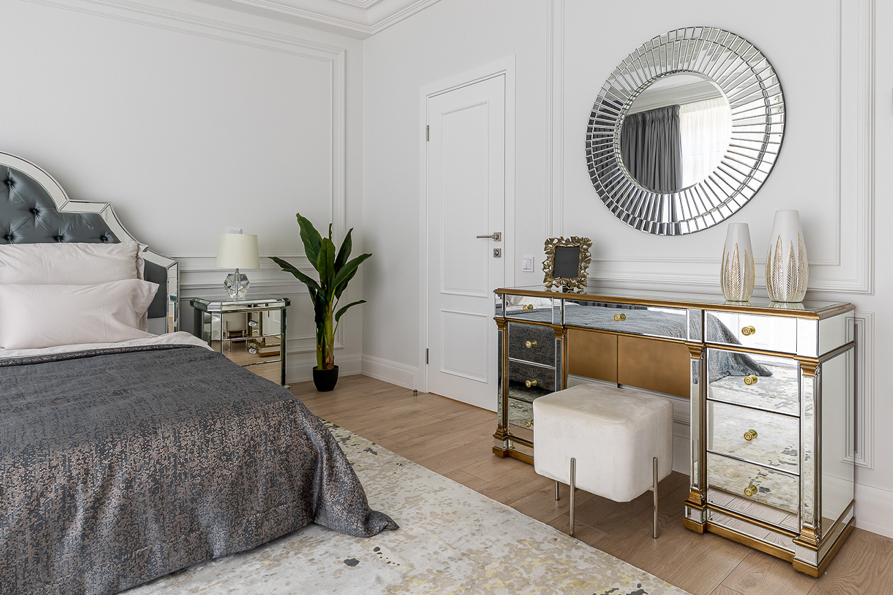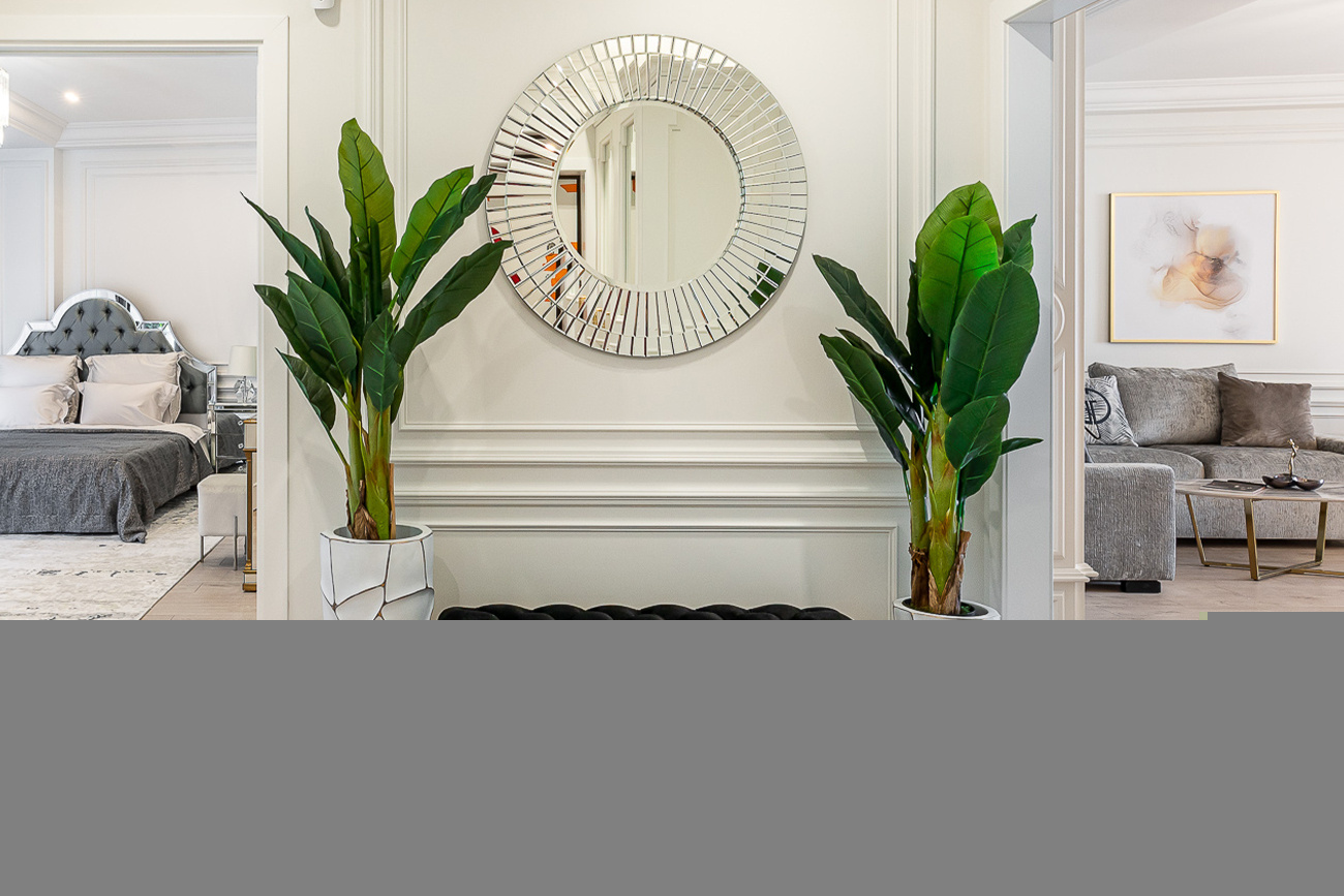 Изысканное зеркало в форме круга понравится и любителям классики, и приверженцам современного дизайна. Его диаметр составляет 91 см, по внешнему краю зеркало украшено интересной рамой, состоящей из тонких прямоугольных лучей. Рама зеркала является выпуклой, что делает вещь еще более оригинальной и запоминающейся.