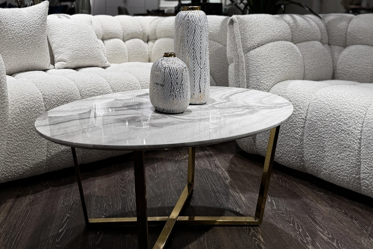 Выбирая мебель для гостиной, мы обычно предпочитаем эргономичные модели. То есть такие, которые обеспечивают передвижение по комнате без помех. Чем примечателен этот овальный журнальный стол? Благодаря удобной форме его можно использовать даже в малогабаритных помещениях – он не займет много места. Удачным вариантом станет такой журнальный стол для гостиной. Благодаря имитации под мрамор предмет смотрится стильно, роскошно, эстетически привлекательно. Модели из этой серии можно посмотреть на сайте в каталоге журнальных столов. Толщина столешницы - 20мм.