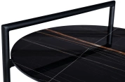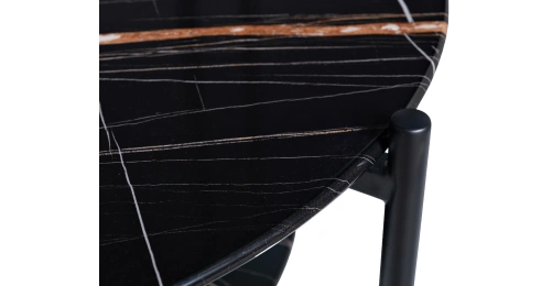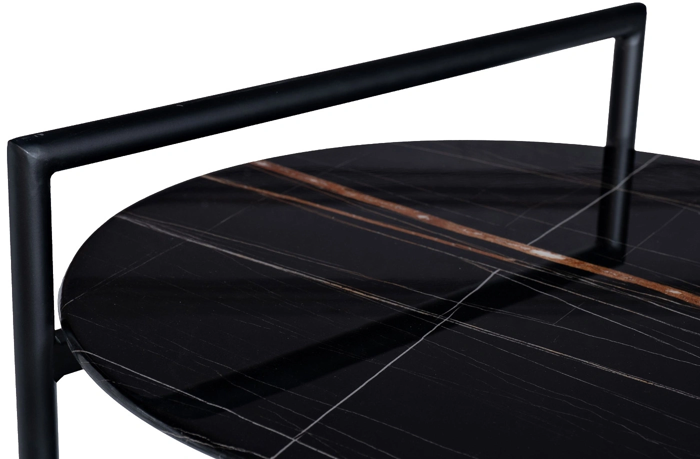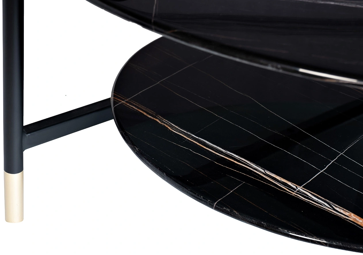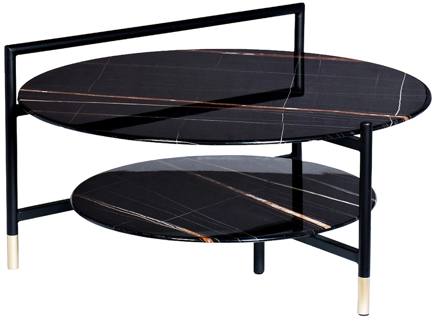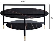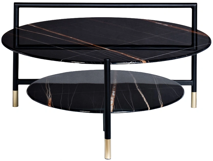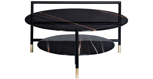 Круглый журнальный столик просто незаменим в любом интерьере. Столешница из прочного закаленного стекла искусно имитирует темный мрамор с яркими цветными прожилками. С такой красивой мебелью оживает любой интерьер. Удобная ручка на столешнице позволяет легко передвинуть стол в нужное место. Изящные золотые наконечники на ножках хорошо сочетаются с темными столешницами, придавая столу особый блеск и красоту. Широкий журнальный столик с полкой – удобный и функциональный предмет мебели, который прекрасно подойдет для гостиной, столовой, спальни или кабинета. Толщина столешниц 8мм.