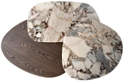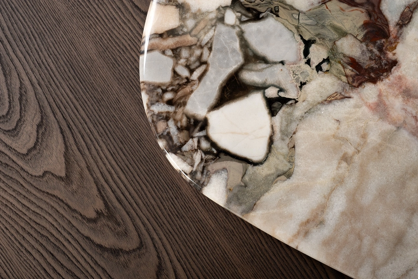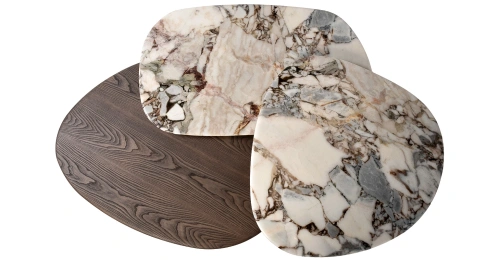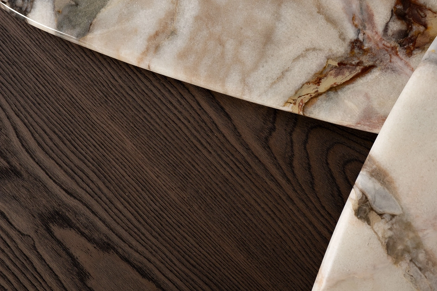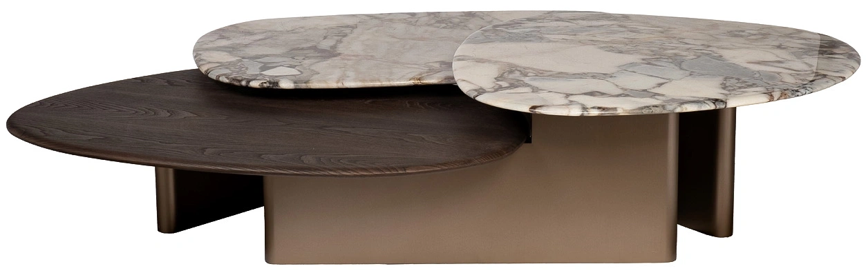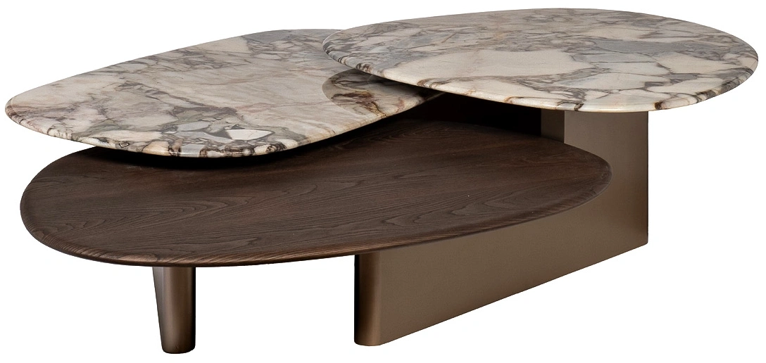 Необычный журнальный стол с тремя столешницами станет изысканным украшением современной гостиной или холла. Две столешницы выполнены из натурального мрамора светлого оттенка с красивым природным рисунком. Третья столешница, расположенная на нижнем уровне, изготовлена из МДФ, отделанного темным шпоном. Такое сочетание материалов и фактур выглядит очень эффектно и подчеркивает уникальность авторского дизайна. Столешница вырезана из натурального мрамора! Рисунок и цвет каждой столешницы индивидуален, неповторим и уникален!