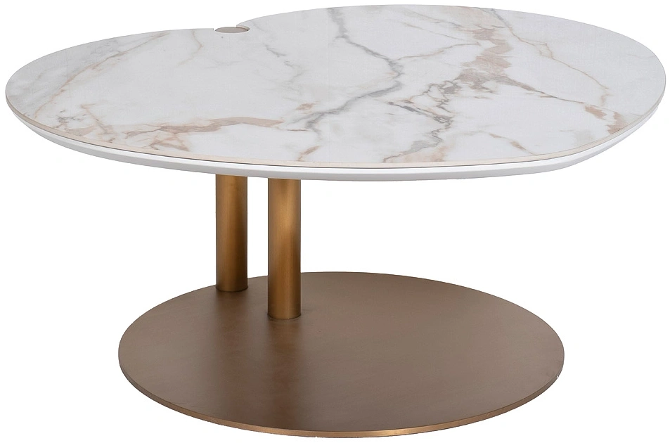 Дизайнерский журнальный стол привлекает внимание благодаря необычному для мебели дизайну. Его столешница из керамики с имитацией под мрамор выполнена в форме сердца, а основание – из металла с эффектом благородной бронзы. Журнальный столик в гостиную отвечает высоким стандартам качества. Он выполнен по европейским технологиям и будет служить десятки лет, не утратив первоначальной эстетики. Стильный стол составит красивый тандем с диваном, дополнит собой комплект кресел, заменит консоль в прихожей. Купить журнальный стол можно с доставкой, а также выбрать мебель, текстиль и интерьерный декор для оформления интерьера в стилистике ар-деко.