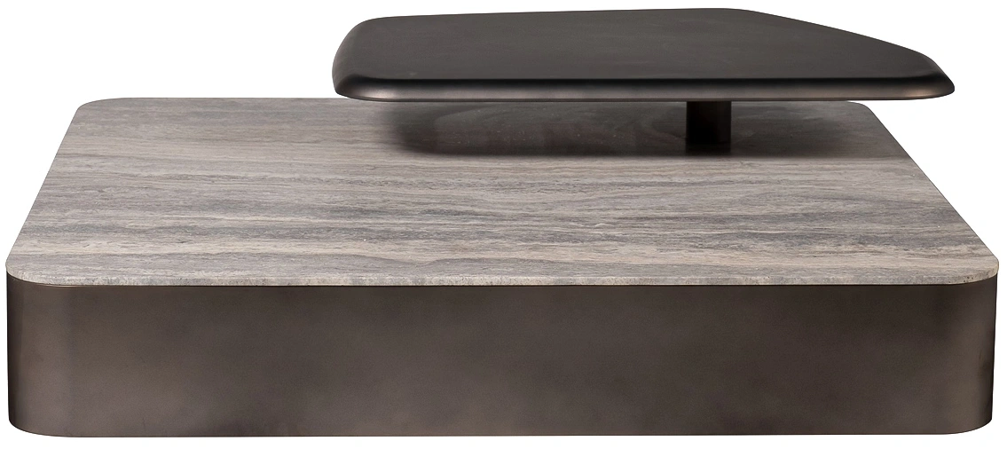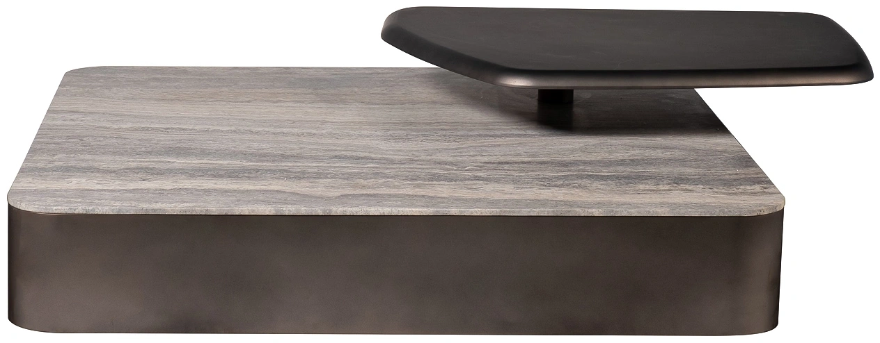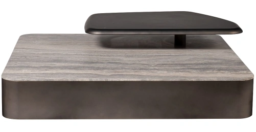 Этот квадратный мраморный журнальный стол с полкой — не просто функциональный элемент, а выверенная архитектурная форма, способная стать центром притяжения любого пространства. Его массивная столешница из натурального мрамора с уникальным узором, напоминающим застывшие реки, придает предмету монументальность и природную глубину. Основание, выполненное из шлифованного металла, создает строгий контраст, подчеркивая благородство камня. Над основной плоскостью расположена дополнительная полка из металла, которую можно повернуть в разные стороны. Её асимметричная форма и темный оттенок добавляют композиции динамики и многослойности, предлагая нетривиальное решение для размещения декора или книг. Этот предмет идеально впишется в современные интерьеры, где ценятся смелые сочетания материалов, скульптурные формы и функциональная эстетика. Стол является воплощением дизайна, который гармонично объединяет природную мощь камня и строгость металла, создавая пространство, наполненное характером и утонченным стилем.