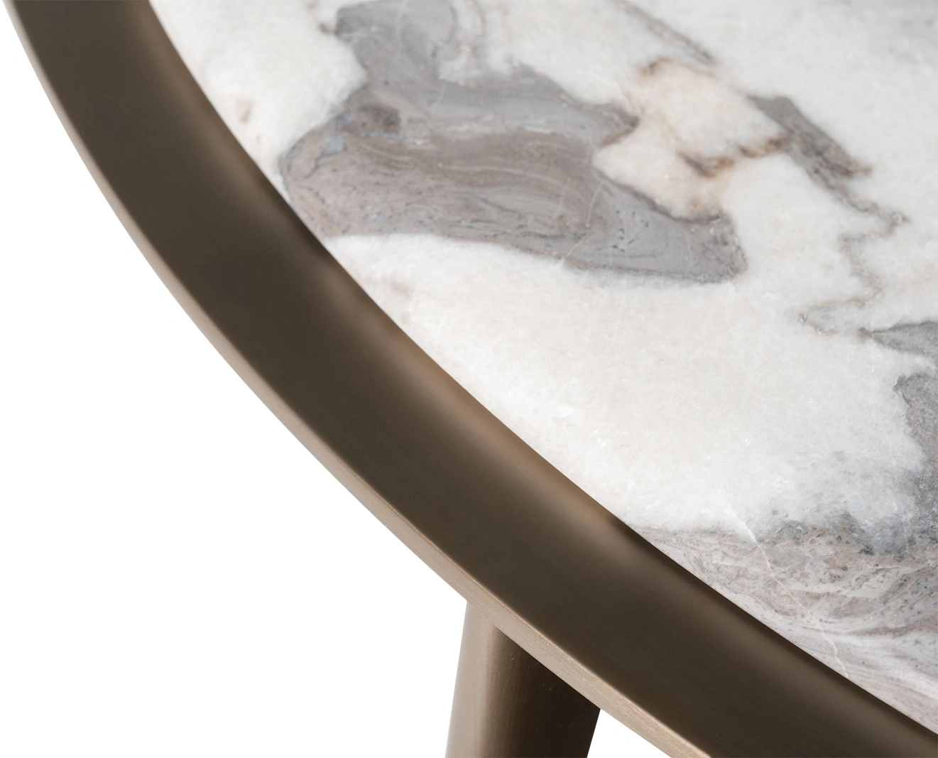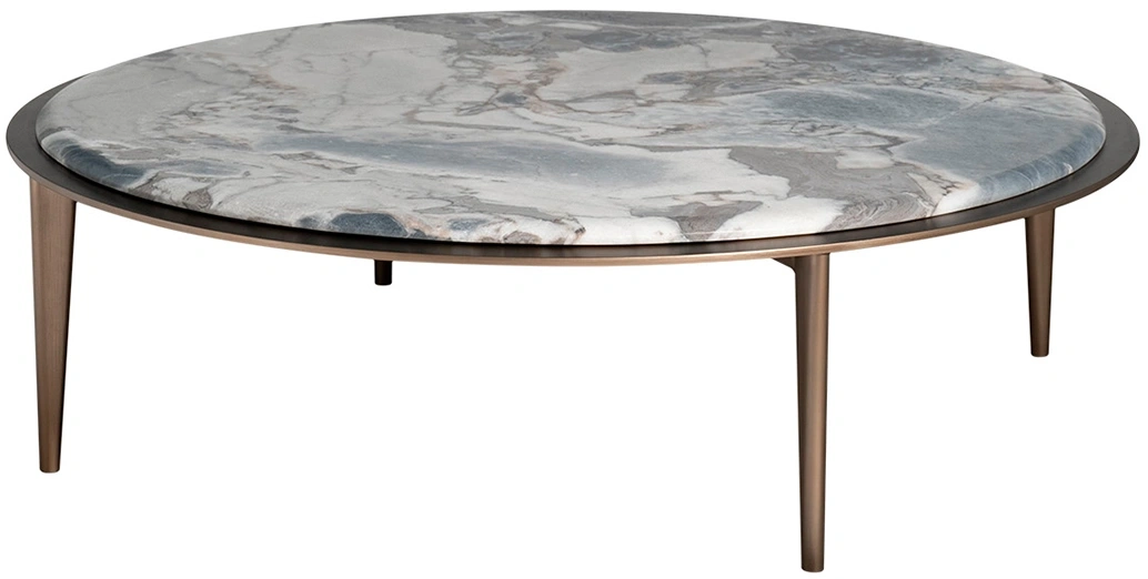 Круглый журнальный стол — скульптура для гостиной, где природа и архитектура сливаются в одном движении. Его столешница из натурального мрамора с плавными серо-голубыми прожилками — как застывший водоворот: каждый узор уникален, будто написан самой землёй. Тонкие ножки из матового металла цвета античной бронзы расходятся от центра, создавая ощущение лёгкости — будто камень парит над полом, не нарушая целостности пространства. Круглая форма мягко обволакивает, делая интерьер дружелюбным и гармоничным. Этот дизайнерский журнальный стол, в котором каждая деталь — от края столешницы до формы ножки — продумана до миллиметра. Мраморный журнальный стол — не просто поверхность для книг и чашек, а заявление о вкусе, которое говорит само за себя.