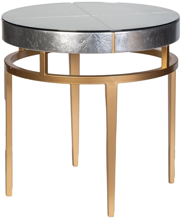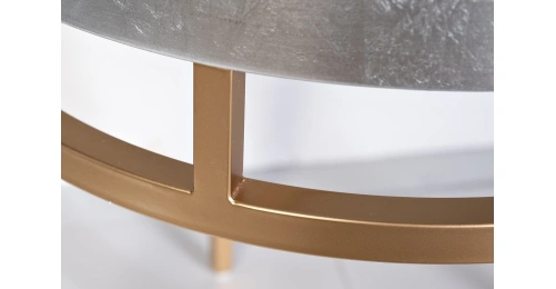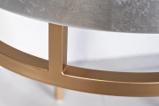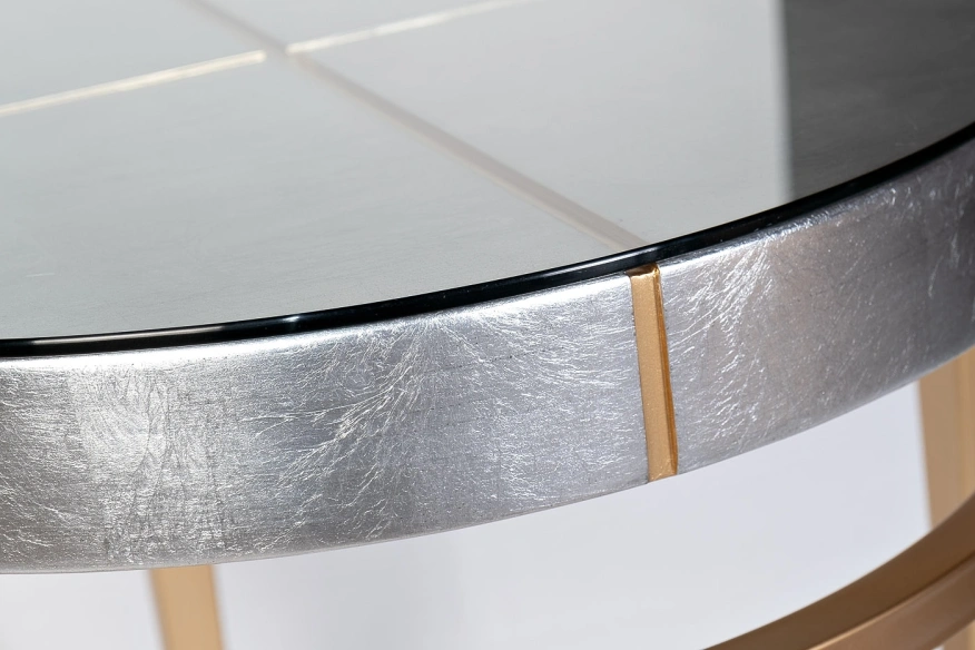 Современный дизайнерский столик производит неизгладимое впечатление изысканной простотой и минималистичной формой. Красивая отделка тончайшей серебристой фольгой сочетается со вставками, подстольем и ножками золотисто-медного цвета. Журнальный столик прокрашен и залакирован вручную по авторской технологии. В комплект входит стеклянная столешница для защиты поверхности от царапин.