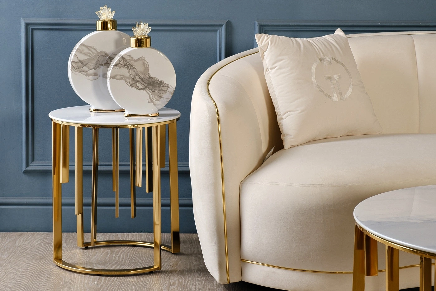 Журнальный круглый столик – первоклассная дизайнерская мебель, в которой проявляется элегантность и аристократический шик. Сочетание основы из стали с благородным золотым блеском и тонкой светлой столешницы с имитацией «под мрамор» выглядит необычайно эффектно. Мраморный журнальный стол превосходно вписывается в стилистику интерьеров ар-деко, модерн, фьюжн, неоклассика, минимализм. Небольшой по габаритам столик станет красивым и полезным дополнением к обстановке гостиной или рабочего кабинета, его также можно использовать в качестве тумбы и подставки для вазы или настольной лампы.