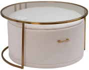 Журнальный стол с пуфом – интересная мебель с эффектным дизайном и расширенным функционалом. Круглый журнальный столик сочетает в себе надежный каркас из блестящей нержавеющей стали и прозрачную столешницу из закаленного стекла. Он составит отличную компанию диванам и креслам, станет эффектным дополнением к обстановке гостиной. Мягкий светлый пуф из велюра является не только дополнительным местом для сидения, но и удобным способом хранения вещей за счет внутреннего пространства. Дизайнерский комплект мебели выглядит стильно и изысканно, легко вписывается в интерьеры ар-деко, неоклассика, модерн. .