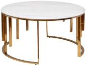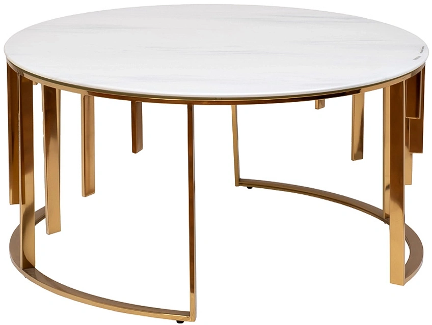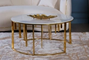 Круглый журнальный стол со светлой столешницей с имитацией под мрамор из закаленного стекла и оригинальным основанием из позолоченной нержавеющей стали. Он станет эффектным акцентом интерьера и составит стильную компанию мягкой мебели в гостиной, рабочем кабинете, холле. Журнальный стол из стекла с эффектом мрамора выглядит интересно за счет основы необычной формы. Именно она придает мебели визуальной легкости и элегантности. На столешнице из стекла красиво смотрятся кашпо и вазы с цветами, фигурки, сувениры, подсвечники, фоторамки и другой интерьерный декор.