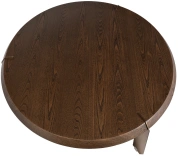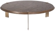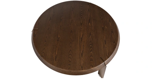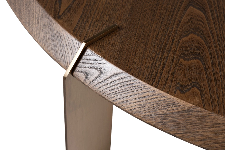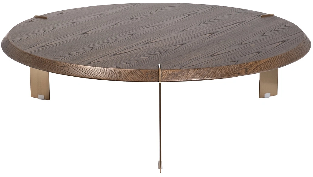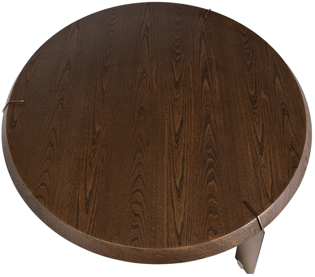 Современный круглый журнальный столик станет стильным дополнением гостиной или холла. Столешница выполнена из МДФ, отделанного шпоном дерева, тонированного в насыщенный оттенок мокко. Благородный рисунок натурального дерева придает изделию уникальность - каждый столик обладает своим неповторимым рисунком. Оригинальные опоры цвета матового золота выполнены из металла и создают интересный контраст с теплой фактурой дерева.